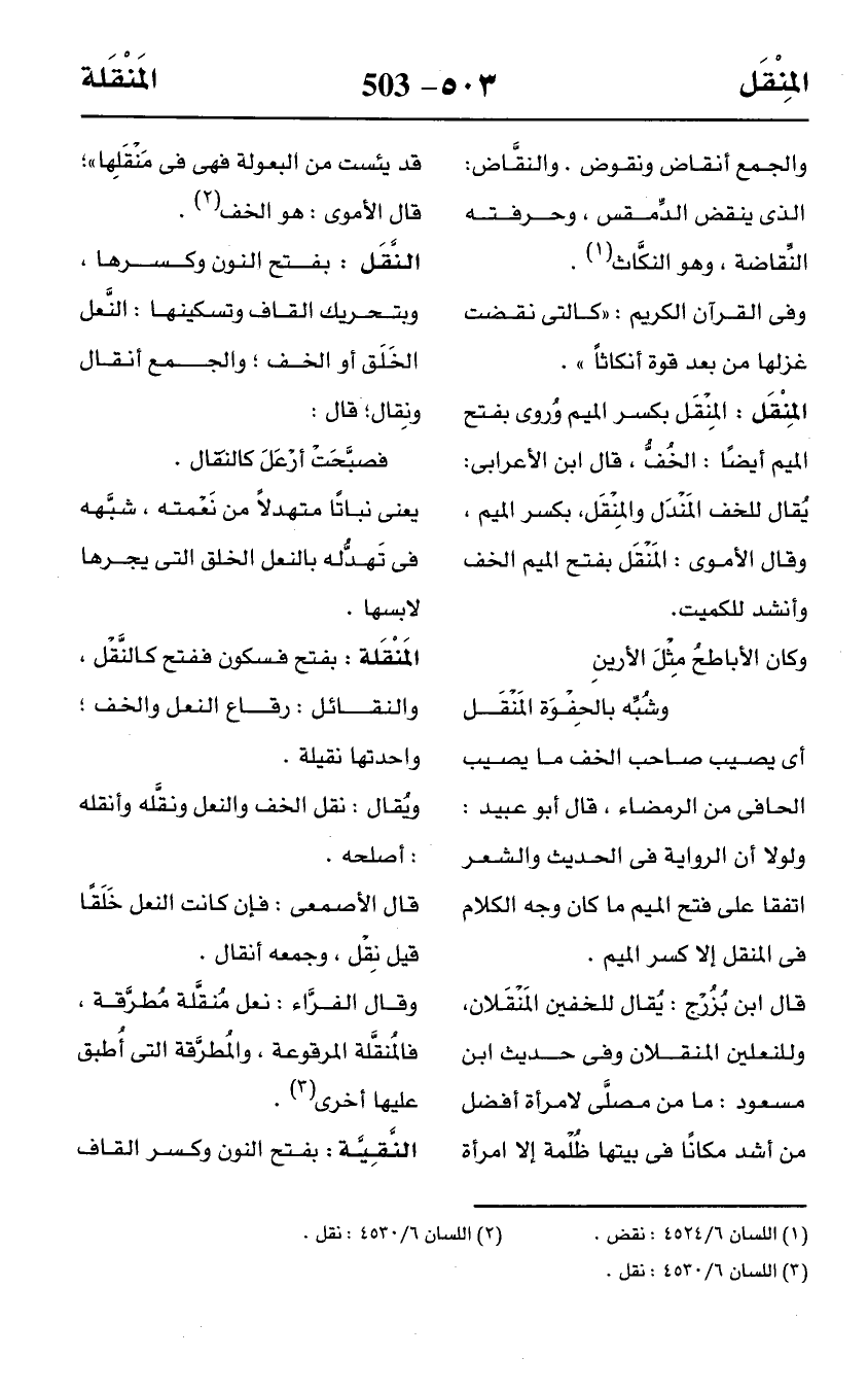 قال ابن بُزُرْج: يُقال للخفين المَنْقَلان، وللنعلين المنقلان وفى حديث ابن مسعود: ما من مصلَّى لامرأة أفضل من أشد مكانًا في بيتها ظُلْمة إِلا امرأة قد يئست من البعولة فهى في مَنْقَلِها"؛ قال الأموى: هو الخف (¬2).