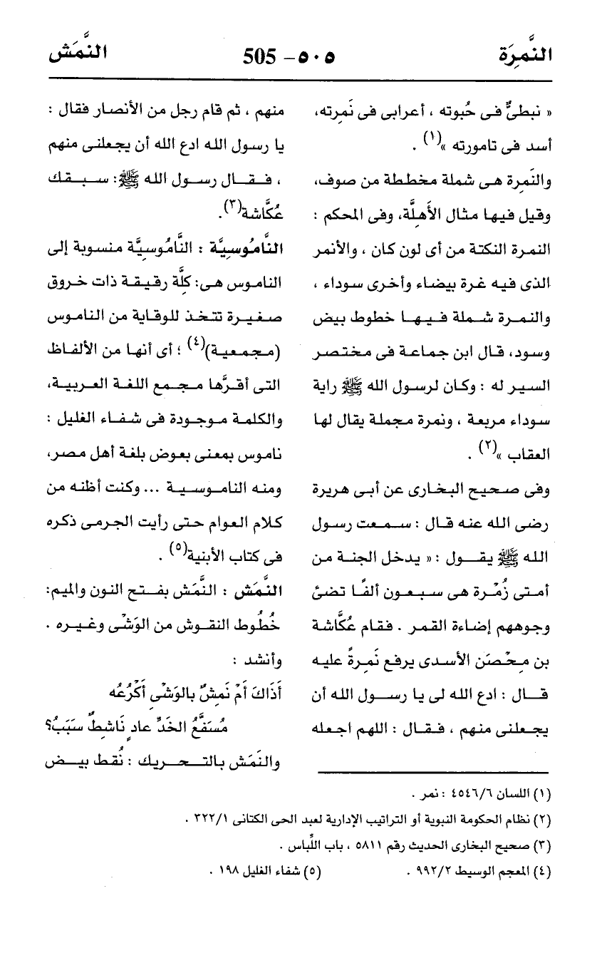 والنَمِرة هى شملة مخططة من صوف، وقيل فيها مثال الأَهِلَّة، وفى المحكم: النمرة النكتة من أى لون كان، والأنمر الذى فيه غرة بيضاء وأخرى سوداء، والنمرة شملة فيها خطوط بيض وسود، قال ابن جماعة في مختصر السير له: وكان لرسول اللَّه -صلى اللَّه عليه وسلم- راية سوداء مربعة، ونمرة مجملة يقال لها العقاب" (¬2).