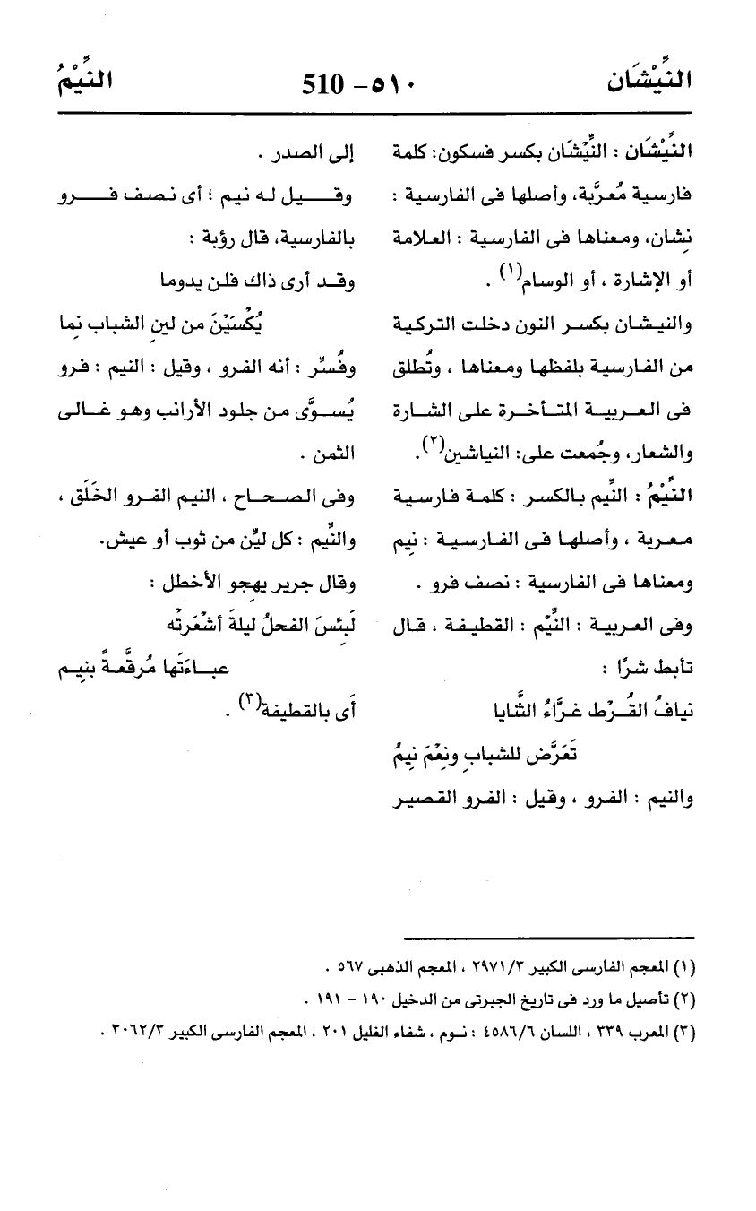 (¬3) المعرب 339، اللسان 6/ 4586: نوم، شفاء الغليل 201، المعجم الفارسى الكبير 3/ 3062.