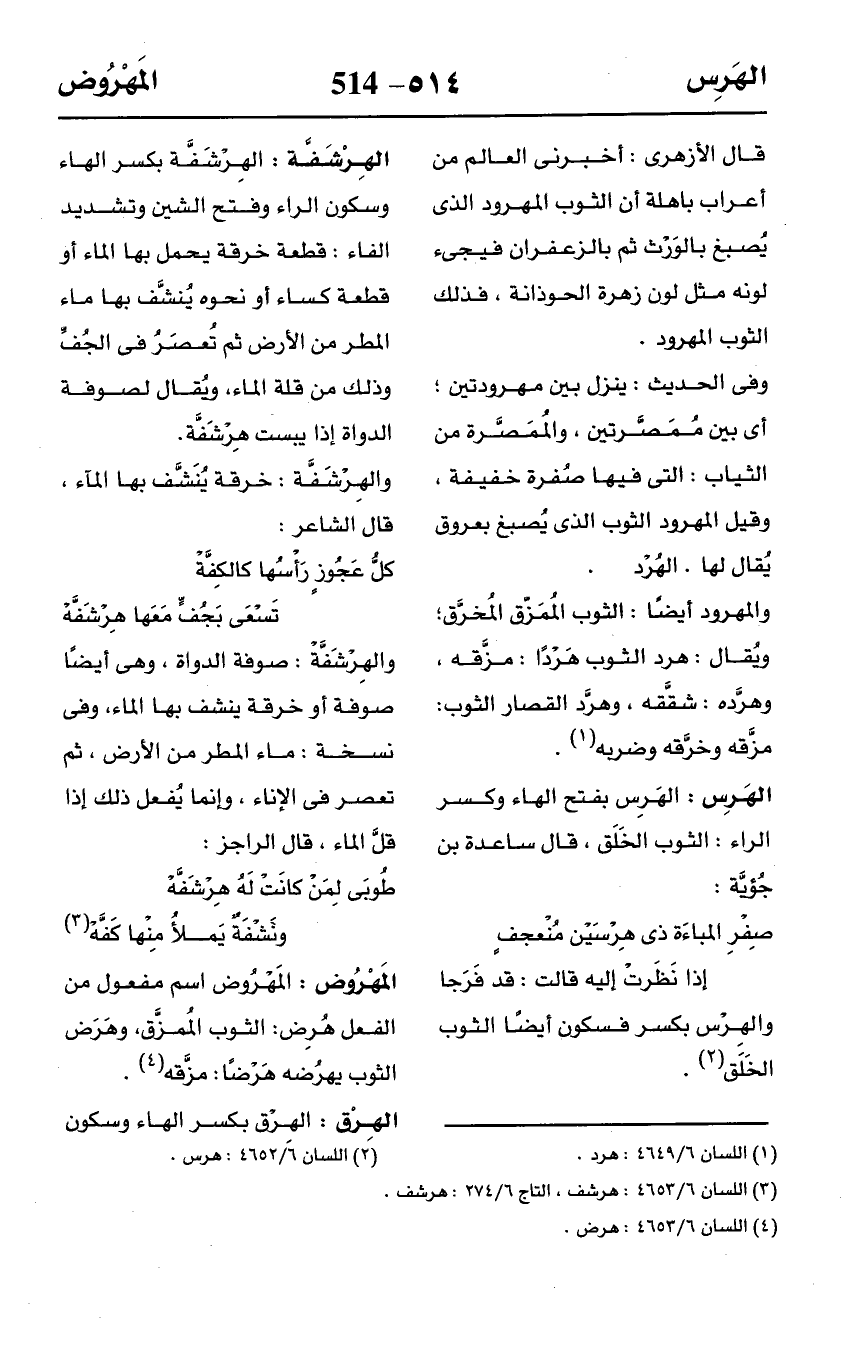 قال الأزهرى: أخبرنى العالم من أعراب باهلة أن الثوب المهرود الذى يُصبغ بالوَرْث ثم بالزعفران فيجئ لونه مثل لون زهرة الحوذانة، فذلك الثوب المهرود.