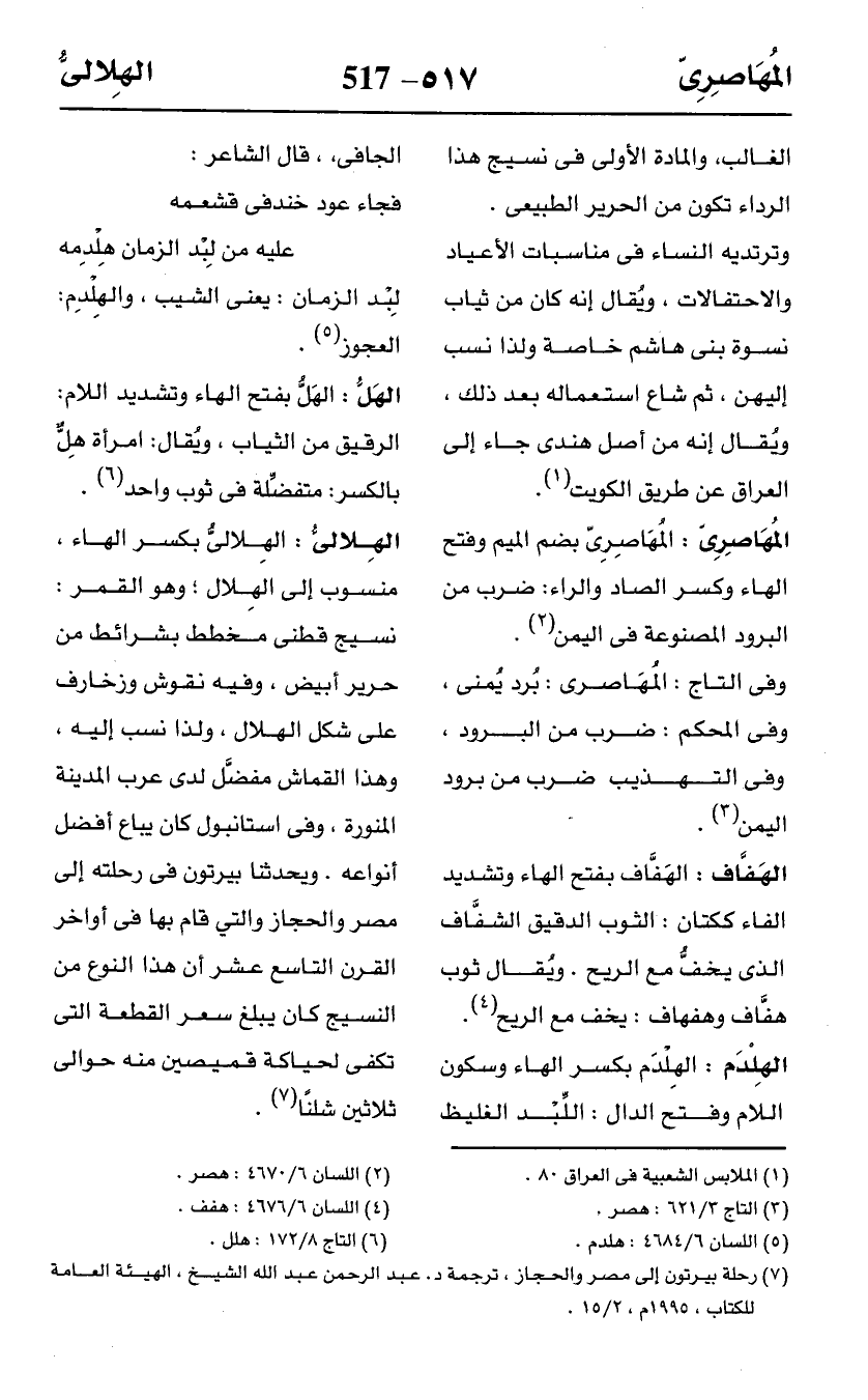 الهِلالىُّ: الهِلالىُّ بكسر الهاء، منسوب إلى الهِلال؛ وهو القمر: نسيج قطنى مخطط بشرائط من حرير أبيض، وفيه نقوش وزخارف على شكل الهلال، ولذا نسب إليه، وهذا القماش مفضَّل لدى عرب المدينة المنورة، وفى استانبول كان يباع أفضل أنواعه. ويحدثنا بيرتون في رحلته إلى مصر والحجاز والتي قام بها في أواخر القرن التاسع عشر أن هذا النوع من النسيج كان يبلغ سعر القطعة التى تكفى لحياكة قميصين منه حوالى ثلاثين شلنًا (¬7).