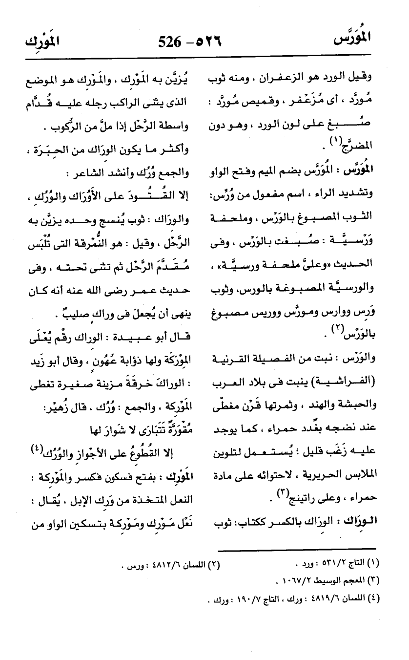 المُوَرَّس: المُوَرَّس بضم الميم وفتح الواو وتشديد الراء، اسم مفعول من وُرِّس: الثوب المصبوغ بالوَرْس، وملحفة وَرْسيَّة: صُبغت بالوَرْس، وفى الحديث "وعلىَّ ملحفة ورسيَّة"، والورسيَّة المصبوغة بالورس، وثوب وَرس ووارس ومورَّس ووريس مصبوغ بالوَرْس (¬2).