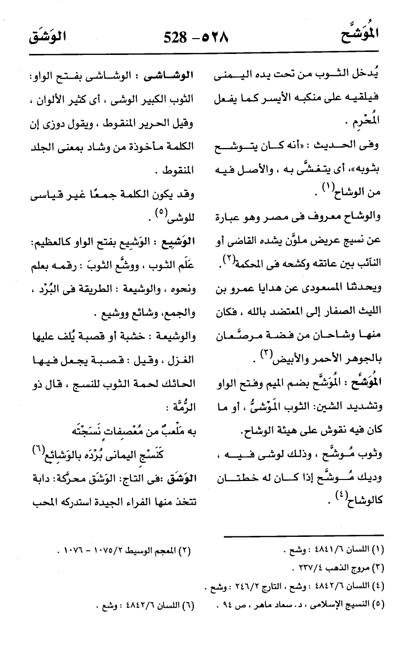 الوشاشى: الوشاشى بفتح الواو: الثوب الكبير الوشى، أى كثير الألوان، وقيل الحرير المنقوط، ويقول دوزى إن الكلمة مأخوذة من وشاد بمعنى الجلد المنقوط.