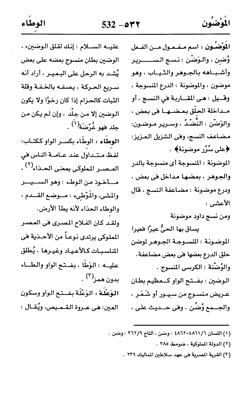 الوِطَاء: الوِطَاء بكسر الواو ككتاب: لفظ متداول عند عامة الناس في العصر المملوكى بمعنى الحذاء (¬2)، مأخوذ من الوطء: وهو السير والمشى، والمَوْطِئ: موضع القدم، والوطاء الحذاء لأنه يطأ الأرض.