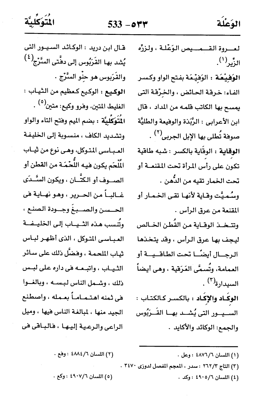 المُتَوَكِّلِيَّة: بضم الميم وفتح التاء والواو وتشديد الكاف، منسوبة إلى الخليفة العباسى المتوكل، وهى نوع من ثياب المُلْحَم يكون فيه اللُّحْمَة من القطن أو الصوف أو الكتَّان، ويكون السَّدَى غالبًا من الحرير، وهو نهاية في الحسن والصبغَ وجودة الصنع، وتُنسب هذه الثياب إلى الخليفة العباسى المتوكل، الذى أظهر لباس ثياب الملحمة، وفضَّل ذلك على سائر الثياب، واتبعه في داره على لبس ذلك، وشمل الناس لبسه، وبالغوا في ثمنه اهتمامًا بعمله، واصطنع الجيد منها، لمبالغة الناس فيها، وميل الراعى والرعية إليها، فالباقى في
