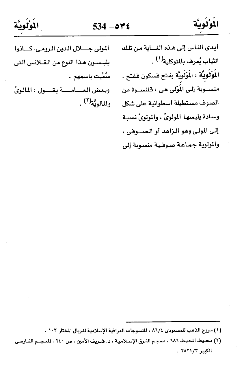 المَوْلَوِيَّة: المَوْلَوِيَّة بفتح فسكون ففتح، منسوبة إلى المَوْلى هى: قلنسوة من الصوف مستطيلة أسطوانية على شكل وسادة يلبسها المولوىّ، والمولوىّ نسبة إلى المولى وهو الزاهد أو الصوفى، والمولوية جماعة صوفية منسوبة إلى المولى جلال الدين الرومى، كانوا يلبسون هذا النوع من القلانس التى سُمِّيت باسمهم.