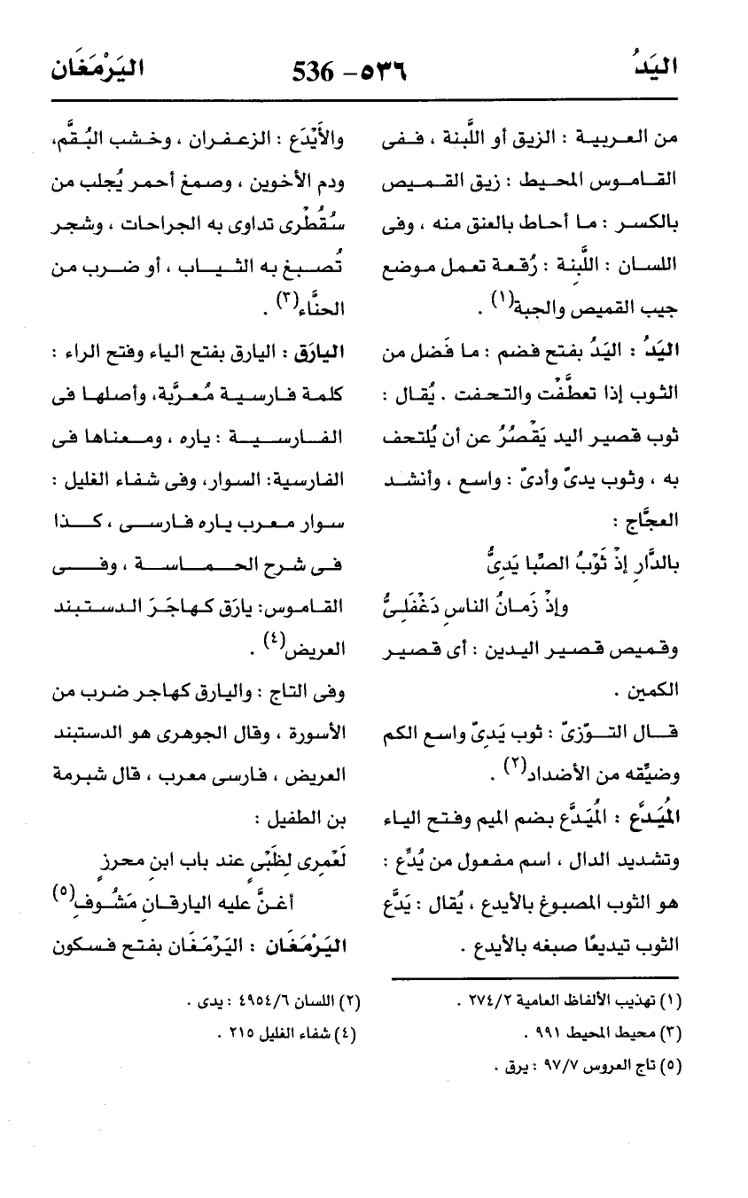 اليارَق: اليارق بفتح الياء وفتح الراء: كلمة فارسية مُعرَّبة، وأصلها في الفارسية: ياره، ومعناها في الفارسية: السوار، وفى شفاء الغليل: سوار معرب ياره فارسى، كذا في شرح الحماسة، وفى القاموس: يارَق كهاجَرَ الدستبند العريض (¬4).