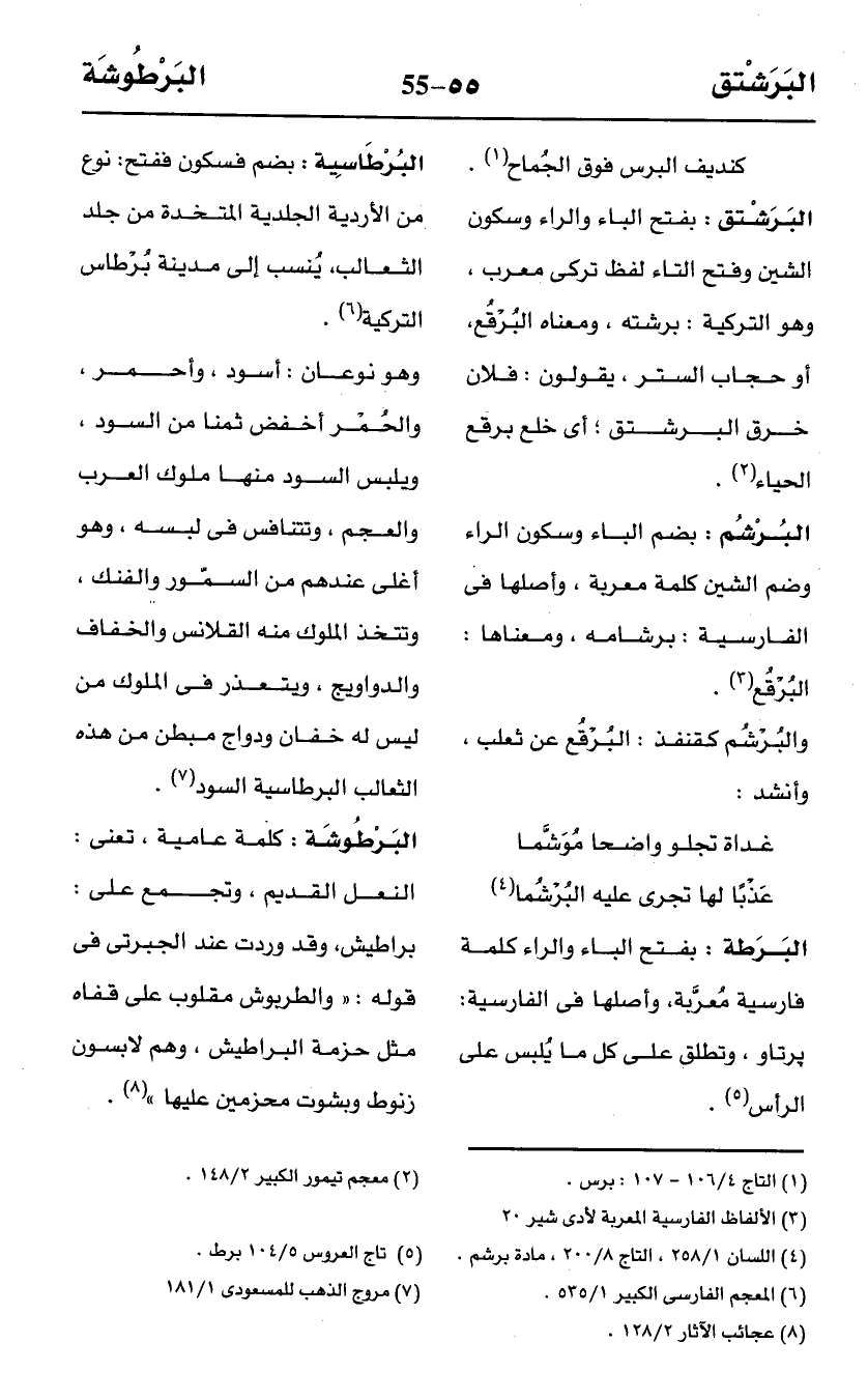 البَرَشْتق: بفتح الباء والراء وسكون الشين وفتح التاء لفظ تركى معرب، وهو التركية: برشته، ومعناه البُرْقُع، أو حجاب الستر، يقولون: فلان خرق البرشتق؛ أى خلع برقع الحياء (¬2).