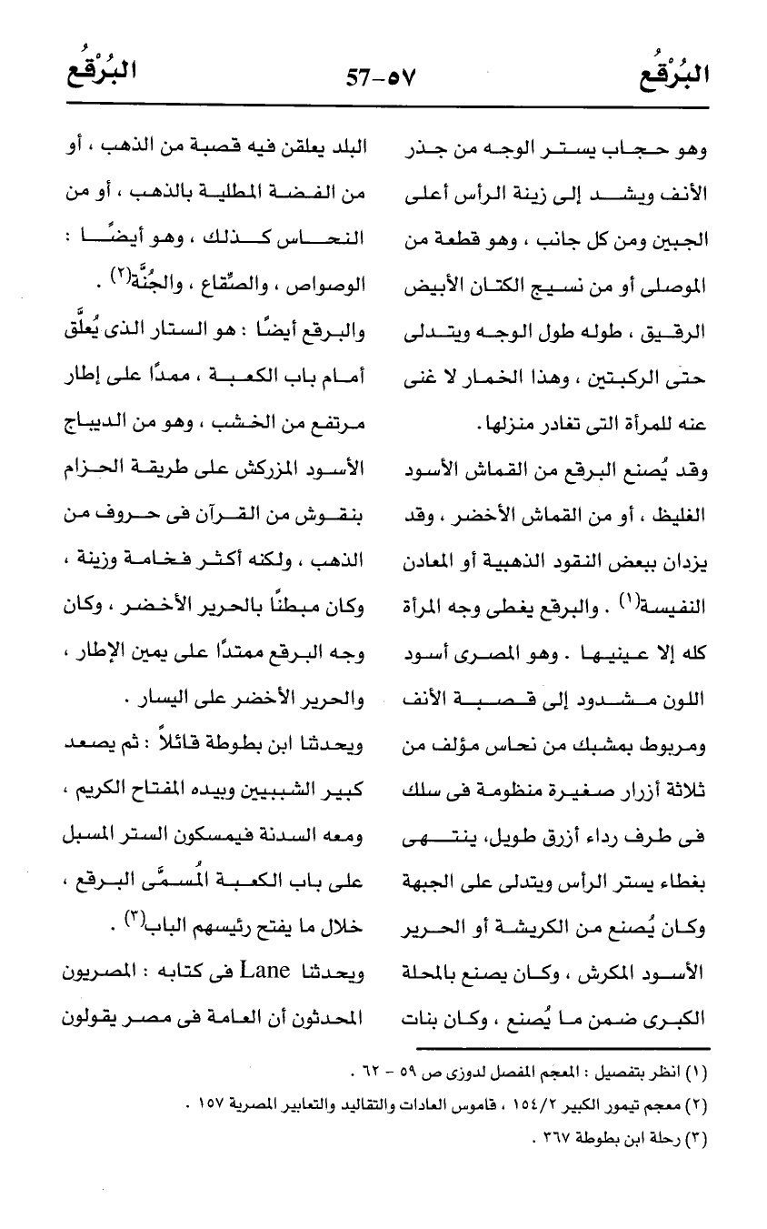 وقد يُصنع البرقع من القماش الأسود الغليظ، أو من القماش الأخضر، وقد يزدان ببعض النقود الذهبية أو المعادن النفيسة (¬1). والبرقع يغطى وجه المرأة كله إلا عينيها. وهو المصرى أسود اللون مشدود إلى قصبة الأنف ومربوط بمشبك من نحاس مؤلف من ثلاثة أزرار صغيرة منظومة في سلك في طرف رداء أزرق طويل، ينتهى بغطاء يستر الرأس ويتدلى على الجبهة وكان يُصنع من الكريشة أو الحرير الأسود المكرش، وكان يصنع بالمحلة الكبرى ضمن ما يُصنع، وكان بنات البلد يعلقن فيه قصبة من الذهب، أو من الفضة المطلية بالذهب، أو من النحاس كذلك، وهو أيضًا: الوصواص، والصِّقاع، والجُنَّة (¬2).