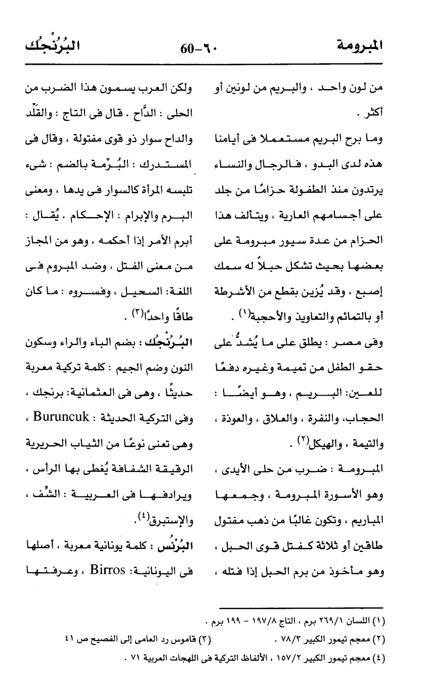 البُرُنْجُك: بضم الباء والراء وسكون النون وضم الجيم: كلمة تركية معربة حديثًا، وهى في العثمانية: برنجك، وفى التركية الحديثة: Buruncuk، وهى تعنى نوعًا من الثياب الحريرية الرقيقة الشفافة يُغطى بها الرأس، ويرادفها في العربية: الشِّف، والإستبرق (¬4).