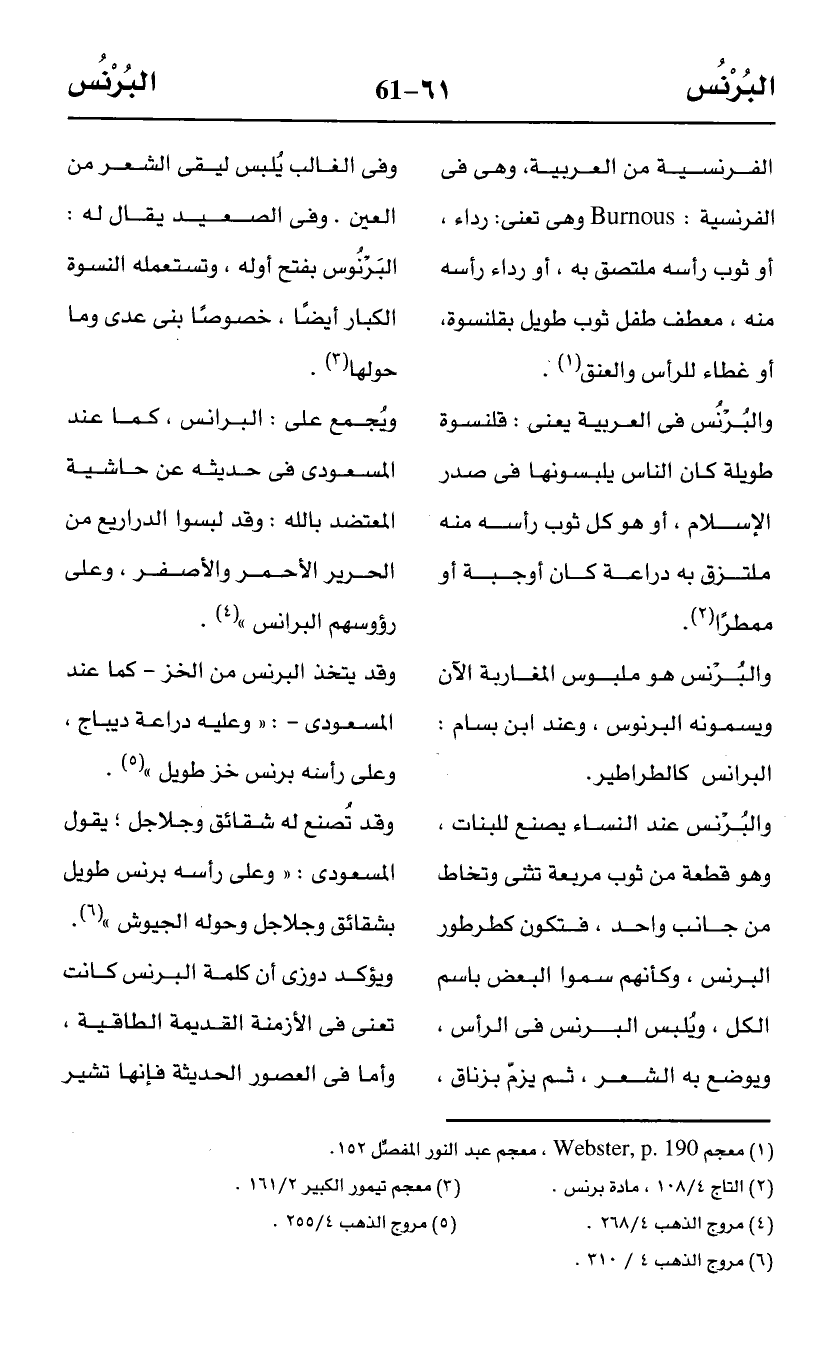 الفرنسية من العربية، وهى في الفرنسية: Burnous وهى تعنى: رداء، أو ثوب رأسه ملتصق به، أو رداء رأسه منه، معطف طفل ثوب طويل بقلنسوة، أو غطاء للرأس والعنق (¬1).