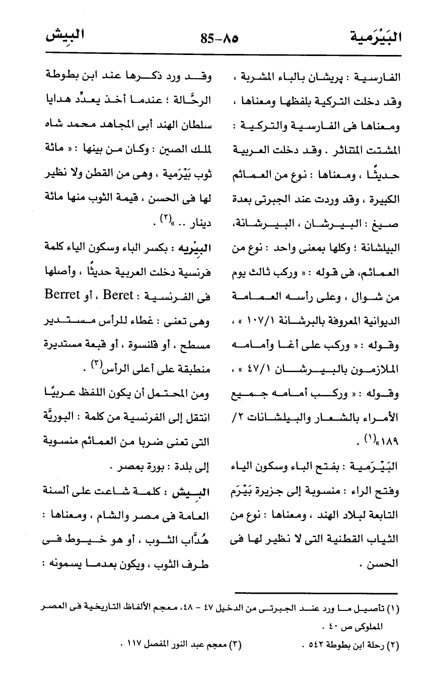 البَيْرَمية: بفتح الباء وسكون الياء وفتح الراء: منسوبة إلى جزيرة بَيْرَم التابعة لبلاد الهند، ومعناها: نوع من الثياب القطنية التى لا نظير لها في الحسن. وقد ورد ذكرها عند ابن بطوطة الرحَّالة؛ عندما أخذ يعدِّد هدايا سلطان الهند أبى المجاهد محمد شاه لملك الصين: وكان من بينها: "مائة ثوب بَيْرَمية، وهى من القطن ولا نظير لها في الحسن، قيمة الثوب منها مائة دينار. . " (¬2).
