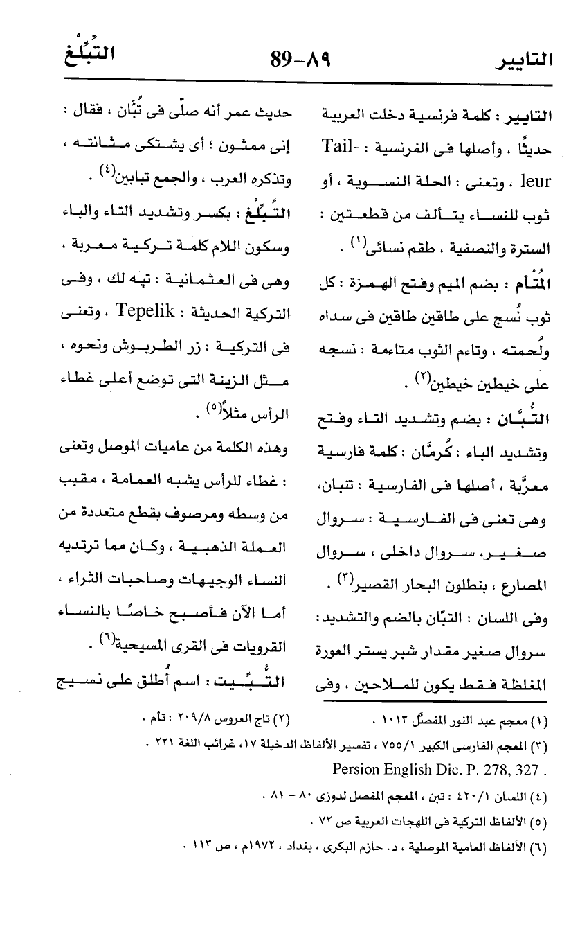 وفى اللسان: التبّان بالضم والتشديد: سروال صغير مقدار شبر يستر العورة المغلظة فقط يكون للملاحين، وفى حديث عمر أنه صلّى في تُبَّان، فقال: إنى ممثون؛ أى يشتكى مثانته، وتذكره العرب، والجمع تبابين (¬4).