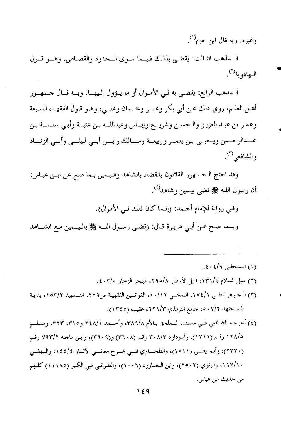 المذهب الرابع: يقضى به في الأموال أو ما يؤول اليها. وبه قال جمهور اهل العلم، روي ذلك عن أبي بكر وعمر وعثمان وعلي، وهو قول الفقهاء السبعة وعمر بن عبد العزيز والحسن وشريح واياس وعبد الله بن عتبة وأبي سلمة بن عبد الرحمن ويحيى بن يعمر وربيعة ومالك وابن أبي ليلى وأبي الزناد والشافعي (¬3) .