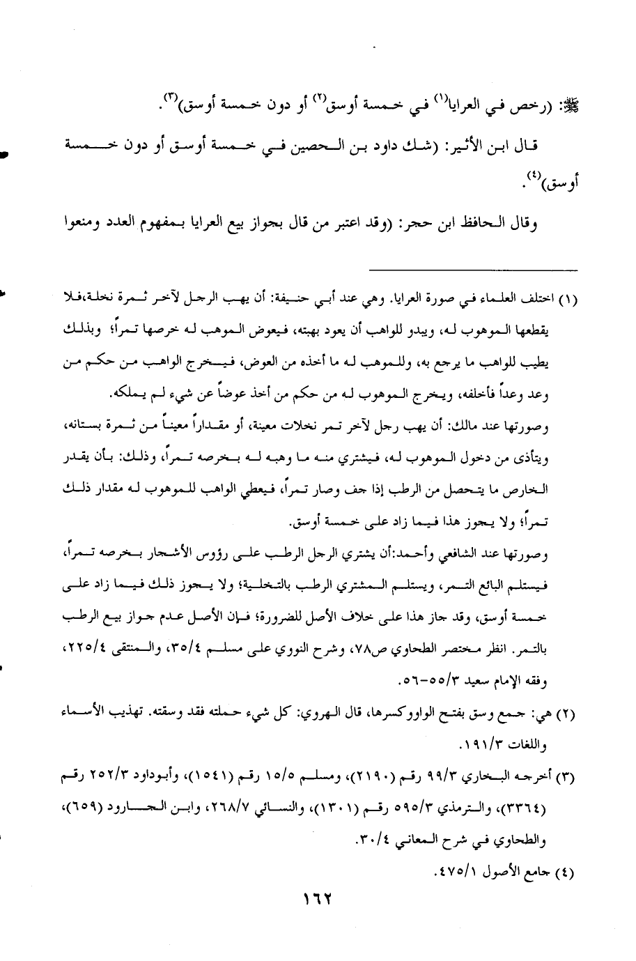(¬1) اختلف العلماء في صورة العرايا. وهي عند أبي حنيفة: أن يهب الرجل لآخر ثمرة نخلة، فلا يقطعها الموهوب له، ويبدوا للواهب أن يعود بهبته، فيعوض الموهب له خرصها تمرا؛ وبذلك يطيب للواهب ما يرجع به، وللموهب له ما أخذه من العوض، فيخرج الواهب من حكم من وعد وعدا فأخلفه، ويخرج الموهوب له من حكم من أخذ عوضا عن شيء لم يملكه.