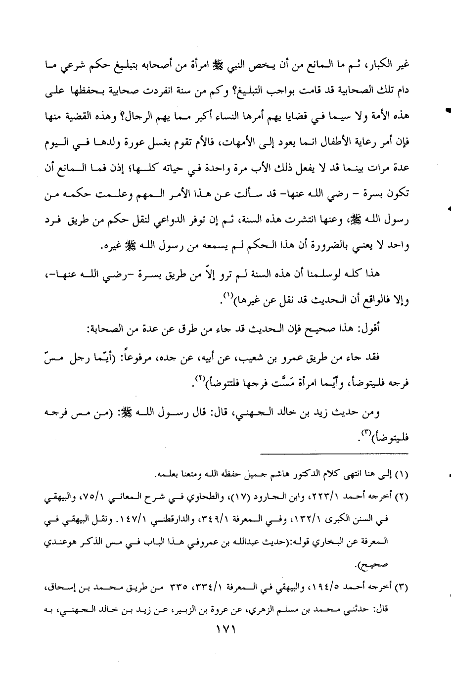 (¬2) أخرجه أحمد 1/223، وابن الجارود (17) ، والطحاوي في شرح المعاني 1/75، والبيهقي في السنن الكبرى 1/132، وفي المعرفة 1/349، والدارقطني 1/147. ونقل البيهقي في المعرفة عن البخاري قوله: ((حديث عبد الله بن عمرو في هذا الباب في مس الذكر هو عندي صحيح)) .