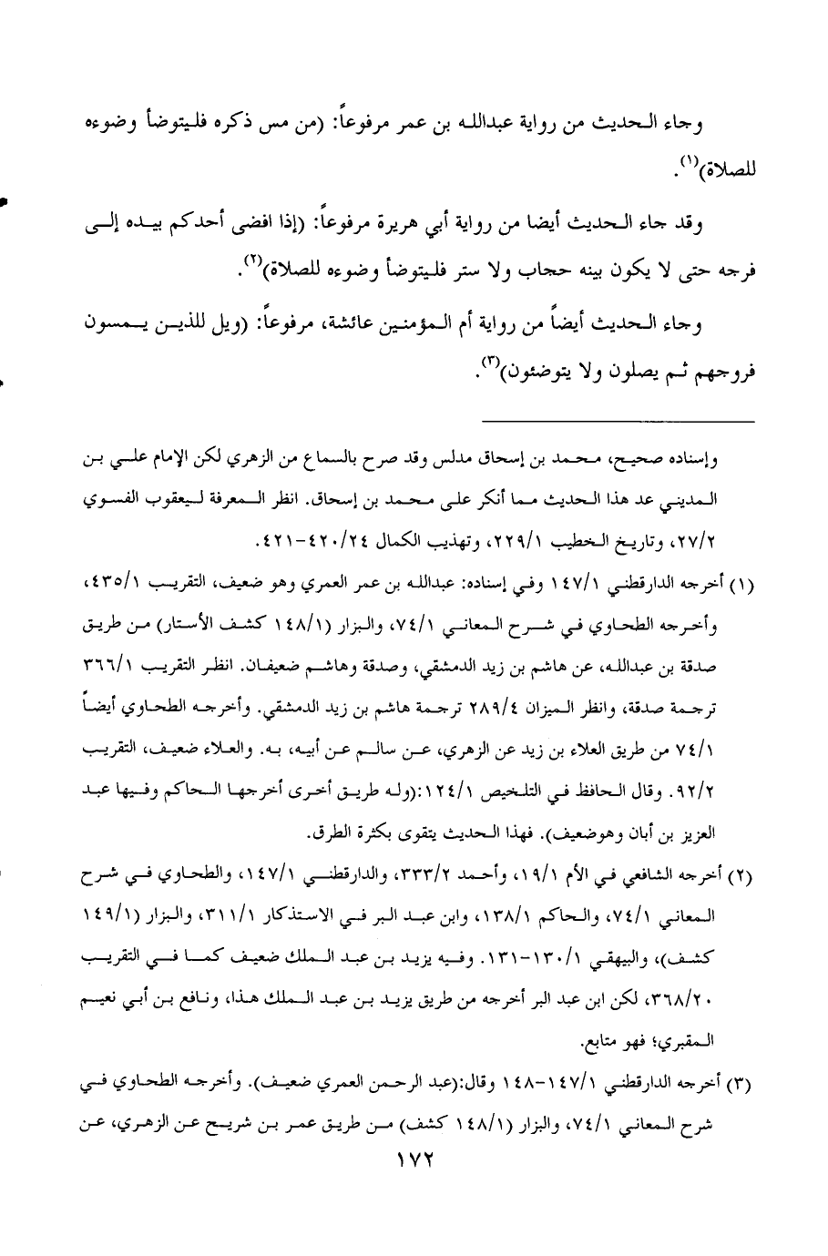 (¬3) أخرجه الدارقطني 1/147-148 وقال: ((عبد الرحمن العمري ضعيف)) . وأخرجه الطحاوي في شرح المعاني 1/74، والبزار ((1/148 كشف)) من طريق عمر بن شريح عن الزهري، عن عروة، عن عائشة، وعمر هذا ضعيف؛ قال الهيثمي في مجمع الزوائد 1/245: ((رواه البزار وفيه عمر بن شريح، قال الأزدي لا يصح حديثه)) . وقد روي هذا عن أم المؤمنين عائشة من قولها: أخرجه الشافعي في الأم 1/20، والحاكم 1/138، والبيهقي 1/33.