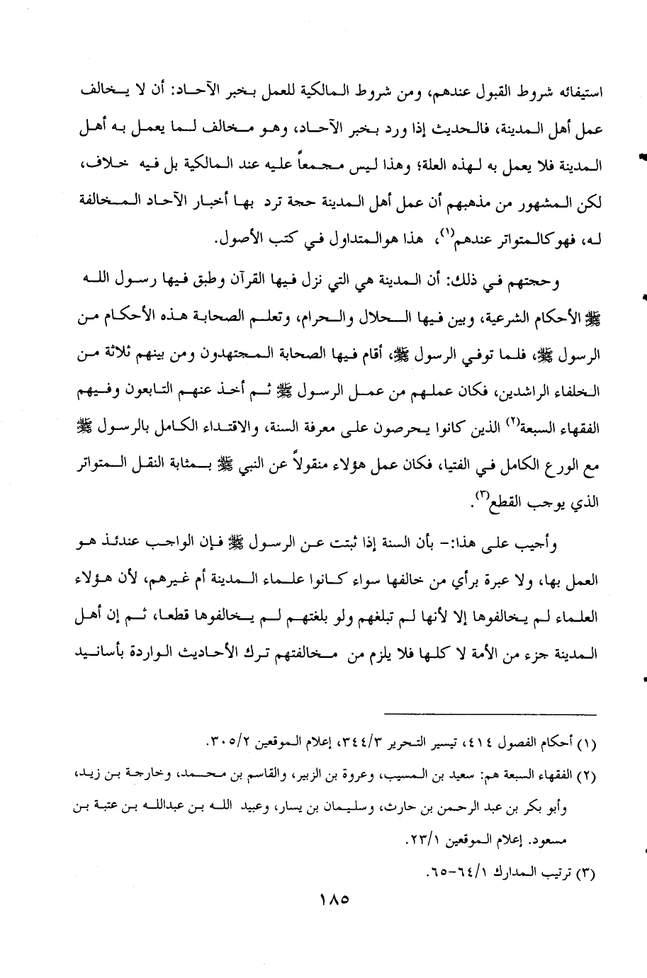 وحجتهم في ذلك: أن المدينة هي التي نزل فيها القرآن وطبق فيها رسول الله صلى الله عليه وسلم الأحكام الشرعية، وبين فيها الحلال والحرام، وتعلم الصحابة هذه الأحكام من الرسول صلى الله عليه وسلم، فلما توفي الرسول صلى الله عليه وسلم، أقام فيها الصحابة المجتهدون ومن بينهم ثلاثة من الخلفاء الراشدين، فكان عملهم من عمل الرسول صلى الله عليه وسلم ثم أخذ عنهم التابعون وفيهم الفقهاء السبعة (¬2) الذين كانوا يحرصون على معرفة السنة، والاقتداء الكامل بالرسول صلى الله عليه وسلم مع الورع الكامل في الفتيا، فكان عمل هؤلاء منقولا عن النبي صلى الله عليه وسلم بمثابة النقل المتواتر الذي يوجب القطع (¬3) .