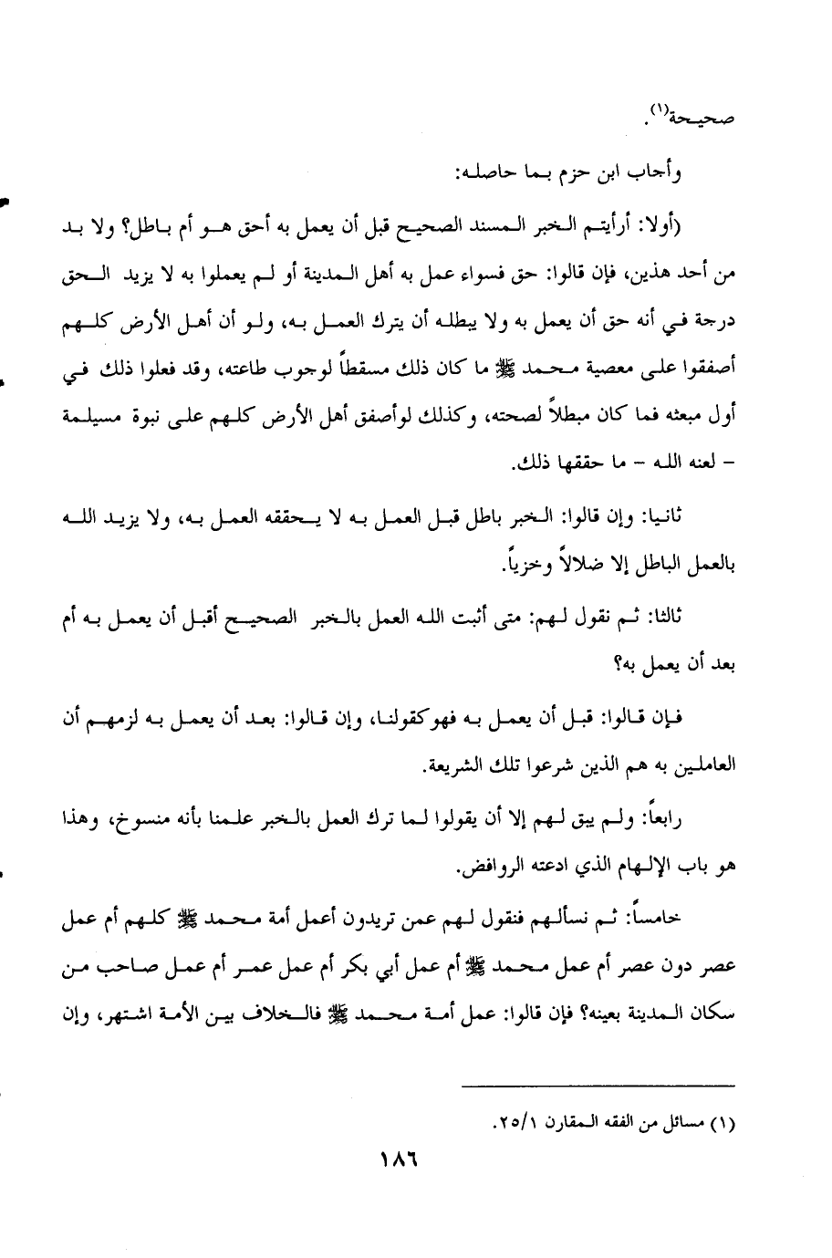 ((أولا: أرأيتم الخبر المسند الصحيح قبل أن يعمل به أحق هو أم باطل؟ ولا بد من أحد هذين، فان قالوا: حق فسواء عمل به أهل المدينة أو لم يعملوا به لا يزيد الحق درجة في أنه حق أن يعمل به ولا يبطله أن يترك العمل به، ولو أن أهل الأرض كلهم أصفقوا على معصية محمد صلى الله عليه وسلم ما كان ذلك مسقطا لوجوب طاعته، وقد فعلوا ذلك في أول مبعثه فما كان مبطلا لصحته، وكذلك لو أصفق أهل الأرض كلهم على نبوة مسيلمة -لعنه الله- ما حققها ذلك.