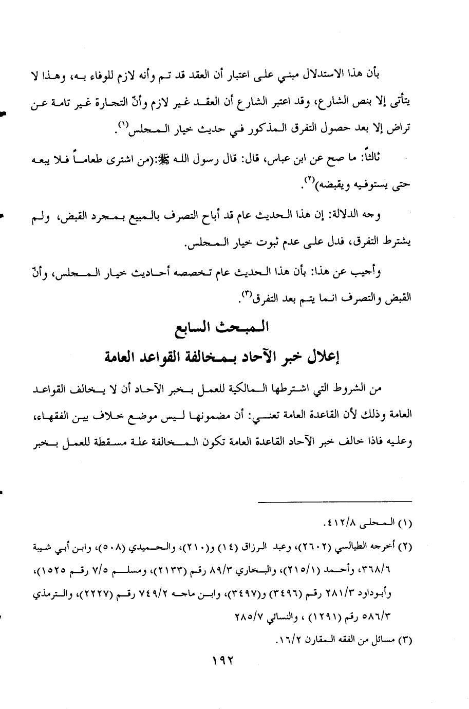 وأجيب عن هذا: بأن هذا الحديث عام تخصصه أحاديث خيار المجلس، وان القبض والتصرف انما يتم بعد التفرق (¬3) .