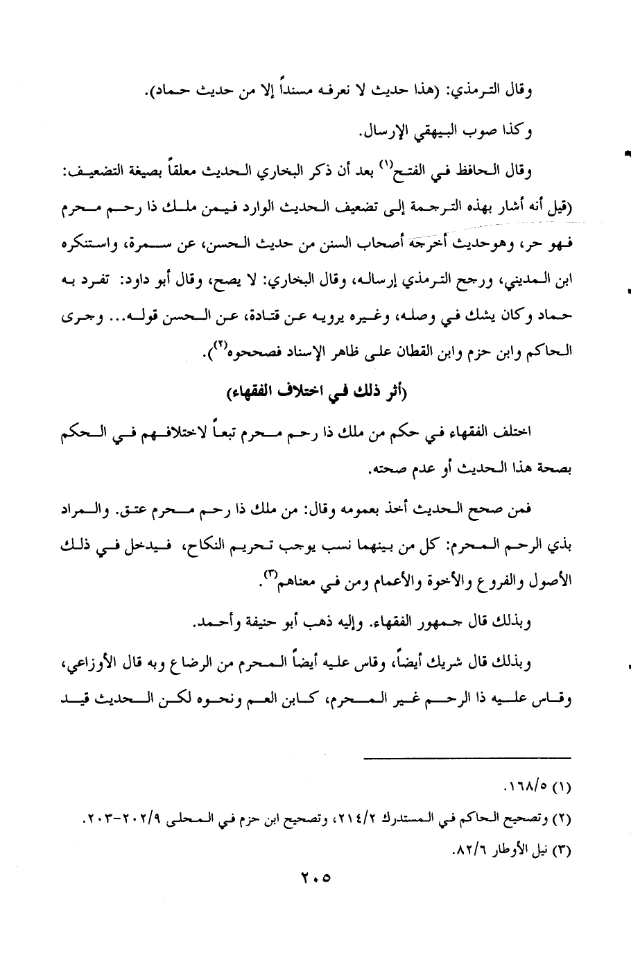 وقال الحافظ في الفتح (¬1) بعد ان ذكر البخاري الحديث معلقا بصيغة التضعيف: ((قيل أنه أشار بهذه الترجمة الى تضعيف الحديث الوارد فيمن ملك ذا رحم محرم فهو حر، وهو حديث أخرجه أصحاب السنن من حديث الحسن، عن سمرة، واستنكره ابن المديني، ورجح الترمذي ارساله، وقال البخاري: لا يصح، وقال أبو داود: تفرد به حماد وكان يشك في وصله، وغيره يرويه عن قتادة، عن الحسن قوله ... وجرى الحاكم وابن حزم وابن القطان على ظاهر الاسناد فصححوه (¬2)) ) .