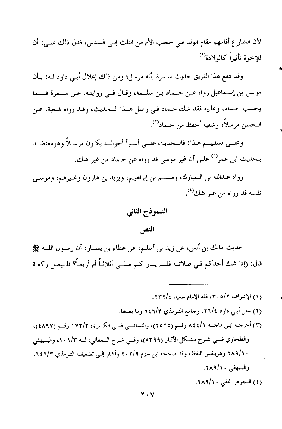 وقد دفع هذا الفريق حديث سمرة بانه مرسل؛ ومن ذلك اعلال أبي داود له: بأن موسى بن اسماعيل رواه عن حماد بن سلمة، وقال في روايته: عن سمرة فيما يحسب حماد، وعليه فقد شك حماد في وصل هذا الحديث، وقد رواه شعبة، عن الحسن مرسلا، وشعبة أحفظ من حماد (¬2) .