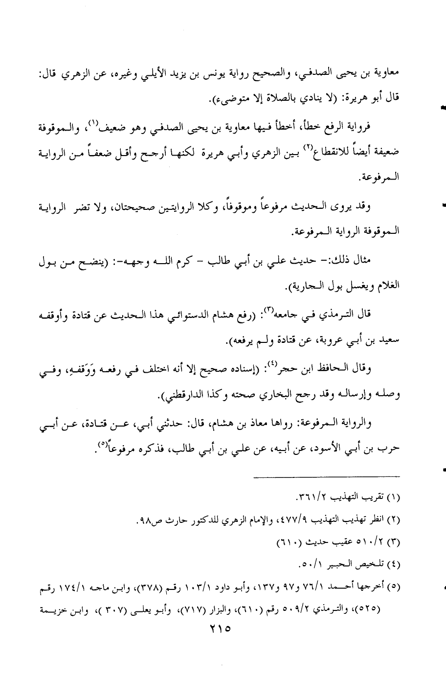 (¬5) أخرجها أحمد 1/76 و 97 و 137، وأبو داود 1/103 رقم (378) ، وابن ماجه 1/174 رقم (525) ، والترمذي 2/509 رقم (610) ، والبزار (717) ، وأبو يعلى (307) ، وابن خزيمة (284) ، والطحاوي في شرح المعاني 1/92، وابن حبان (1375) ، والدارقطني 1/129، والحاكم 1/165، والبيهقي 2/415، والبغوي (296) .