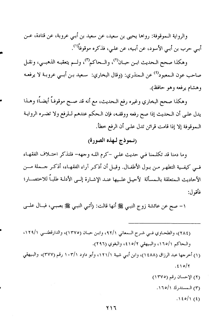 1- صح عن عائشة زوج النبي صلى الله عليه وسلم أنها قالت: ((أتي النبي صلى الله عليه وسلم بصبي، فبال على ثوبه، فدعا النبي صلى الله عليه وسلم بماء فأتبعه اياه)) رواه مالك (¬5) ، وزاد مسلم (¬6) في روايته: ((ولم يغسله)) .