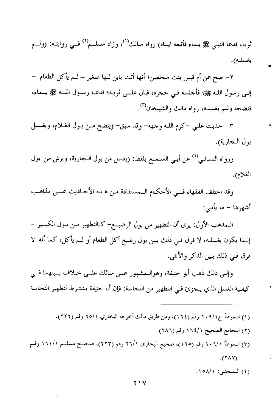 (¬1) الموطأ 1/109 رقم (165) ، صحيح البخاري 1/66 رقم (223) ، صحيح مسلم 1/164 رقم (287) .