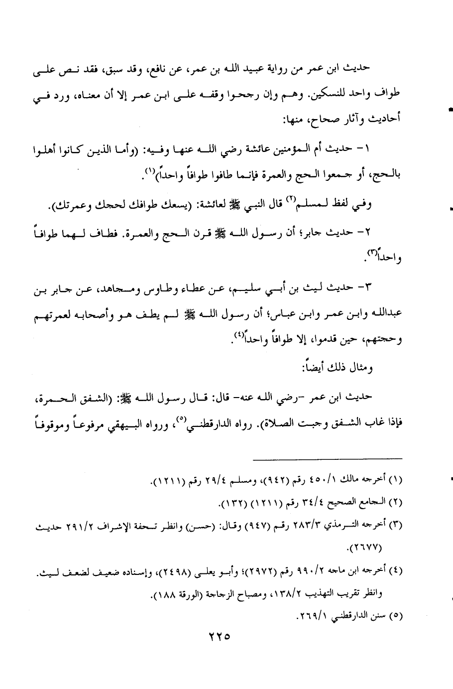 حديث ابن عمر من رواية عبيد الله بن عمر، عن نافع، وقد سبق، فقد نص على طواف واحد للنسكين. وهم وان رجحوا وقفه على ابن عمر الا أن معناه، ورد في أحاديث وآثار صحاح، منها: