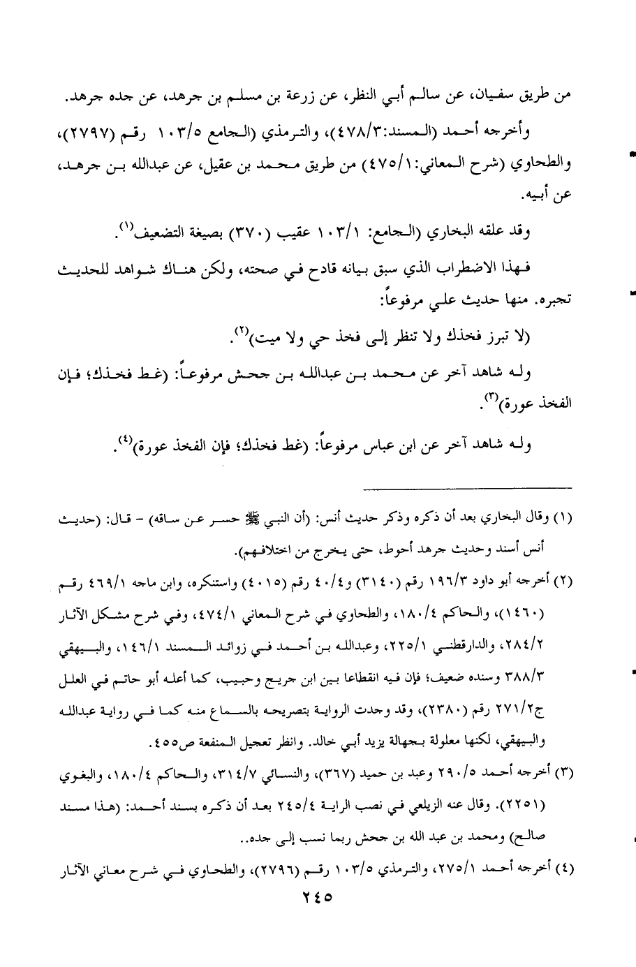 (¬1) وقال البخاري بعد أن ذكره وذكر حديث أنس: ((ان النبي صلى الله عليه وسلم حسر عن ساقه)) -قال: ((حديث أنس أسند وحديث جرهد أحوط، حتى يخرج من اختلافهم))