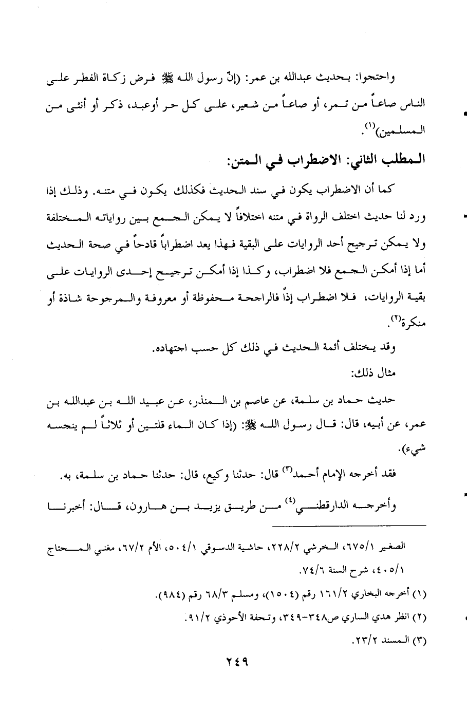 كما أن الاضطراب يكون في سند الحديث فكذلك يكون في متنه. وذلك اذا ورد لنا حديث اختلف الرواة في متنه اختلافا لا يمكن الجمع بين رواياته المختلفة ولا يمكن ترجيح أحد الروايات على البقية فهذا يعد اضطرابا قادحا في صحة الحديث اما اذا أمكن الجمع فلا اضطراب، وكذا اذا أمكن ترجيح احدى الروايات على بقية الروايات، فلا اضطراب اذا فالراجحة محفوظة أو معروفة والمرجوحة شاذة أو منكرة (¬2) .