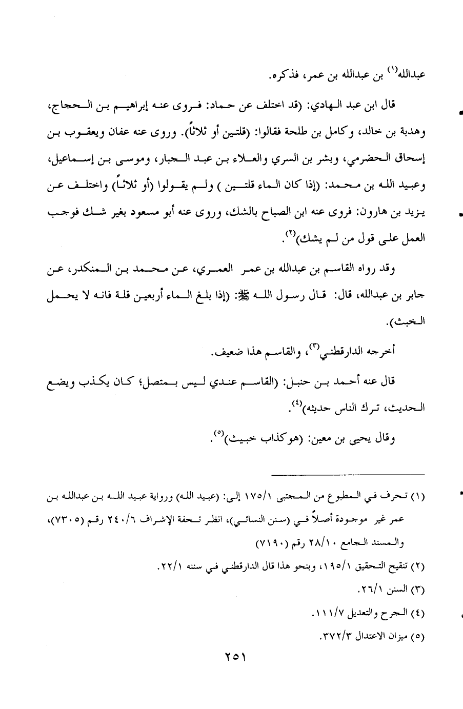 قال ابن عبد الهادي: ((قد اختلف عن حماد: فروى عنه ابراهيم بن الحجاج، وهدبة بن خالد، وكامل بن طلحة فقالوا: ((قلتين أو ثلاثا)) . وروى عنه عفان ويعقوب بن اسحاق الحضرمي، وبشر بن السري والعلاء بن عبد الجبار، وموسى بن اسماعيل، وعبيد الله بن محمد: ((اذا كان الماء قلتين)) ولم يقولوا ((أو ثلاثا)) واختلف عن يزيد بن هارون: فروى عنه ابن الصباح بالشك، وروى عنه أبو مسعود بغير شك فوجب العمل على قول من لم يشك)) . (¬2)