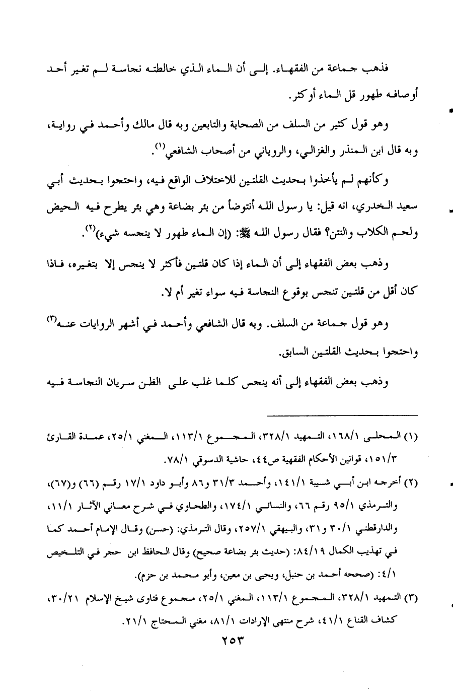(¬2) أخرجه ابن ابي شيبة 1/141، وأحمد 3/31 و 86 وأبو داود 1/17 رقم (66) و (67) ، والترمذي 1/95 رقم 66، والنسائي 1/174، والطحاوي في شرح معاني الآثار 1/11، والدارقطني 1/30 و 31، والبيهقي 1/257،، وقال الترمذي: ((حسن)) وقال الامام أحمد كما في تهذيب الكمال 19/84: ((حديث بئر بضاعة صحيح)) وقال الحافظ ابن حجر في التلخيص 1/4: ((صححه أحمد بن حنبل، ويحيى بن معين، وأبو محمد بن حزم)) .