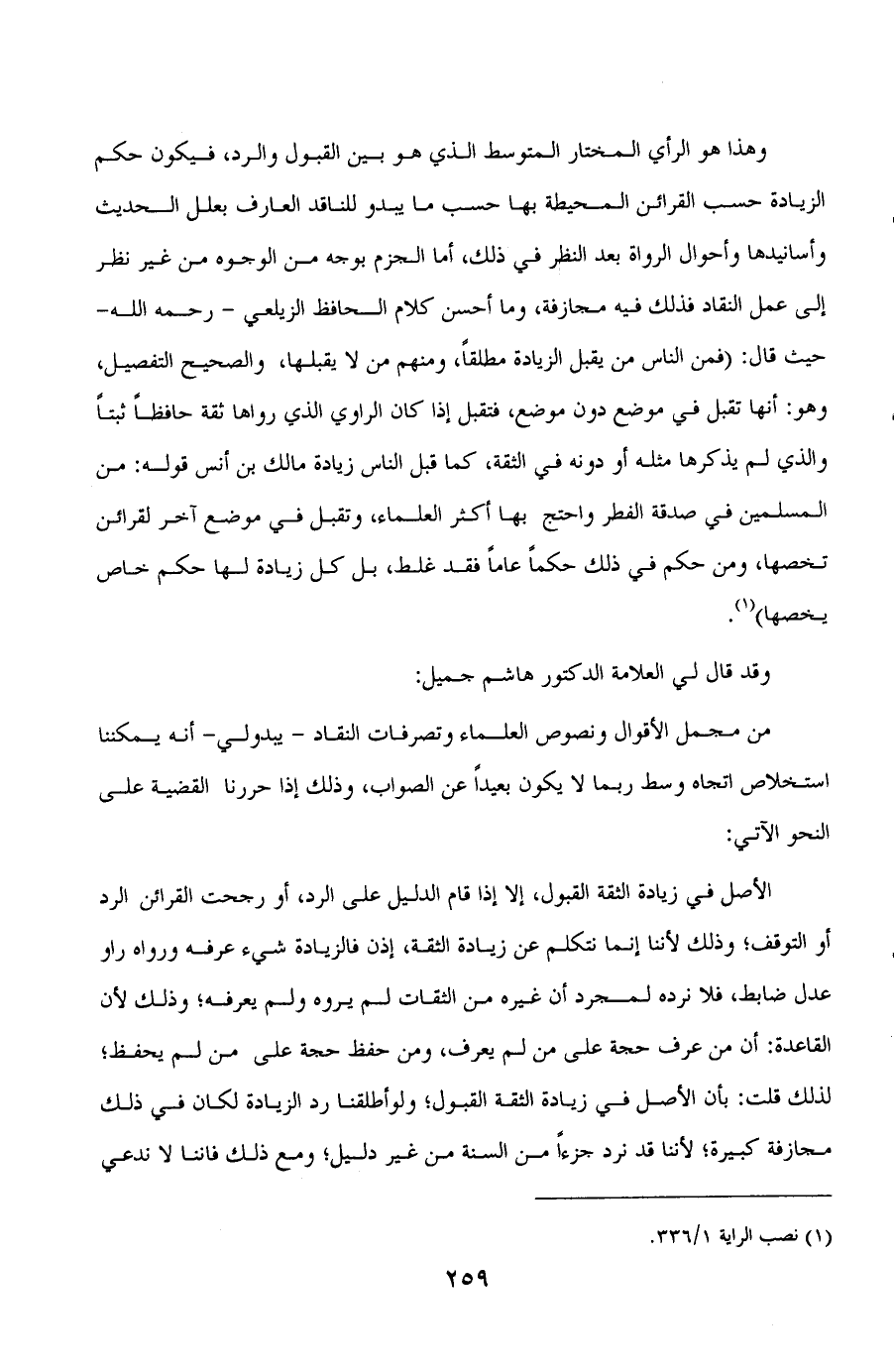 وهذا هو الرأي المختار المتوسط الذي هو بين القبول والرد، فيكون حكم الزيادة حسب القرائن المحيطة بها حسب ما يبدو للناقد العارف بعلل الحديث وأسانيدها وأحوال الرواة بعد النظر في ذلك، أما الجزم بوجه من الوجوه من غير نظر الى عمل النقاد فذلك فيه مجازفة، وما أحسن كلام الحافظ الزيلعي - رحمه الله- حيث قال: ((فمن الناس من يقبل الزيادة مطلقا، ومنهم من لا يقبلها، والصحيح التفصيل، وهو: أنها تقبل في موضع دون موضع، فتقبل اذا كان الراوي الذي رواها ثقة حافظا ثبتا والذي لم يذكرها مثله أو دونه في الثقة، كما قبل الناس زيادة مالك بن أنس قوله: من المسلمين في صدقة الفطر واحتج بها أكثر العلماء، وتقبل في موضع آخر لقرائن تخصها، ومن حكم في ذلك حكما عاما فقد غلط بل كل زيادة لها حكم خاص يخصها)) (¬1) .