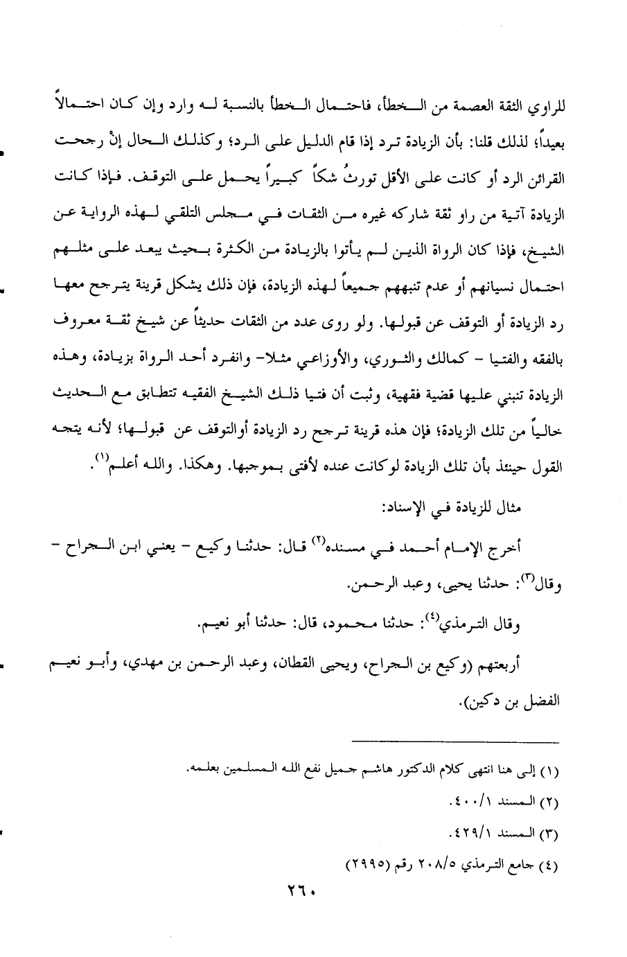 للراوي الثقة العصمة من الخطأ، فاحتمال الخطأ بالنسبة له وارد وان كان احتمالا بعيدا؛ لذلك قلنا: بأن الزيادة ترد اذا قام الدليل على الرد؛ وكذلك الحال ان رجحت القرائن الرد أو كانت على الأقل ثورت شكا كبيرا يحمل على التوقف. فاذا كانت الزيادة آتية من راو ثقة شاركه غيره من الثقات في مجلس التلقي لهذه الرواية عن الشيخ، فاذا كان الرواة الذين لم يأتوا بالزيادة من الكثرة بحيث يبعد على مثلهم احتمال نسيانهم أو عدم تنبههم جميعا لهذه الزيادة، فان ذلك يشكل قرينة يترجح معها رد الزيادة أو التوقف عن قبولها. ولو روى عدد من الثقات حديثا عن شيخ ثقة معروف بالفقه والفتيا - كمالك والثوري، والأوزاعي مثلا- وانفرد أحد الرواة بزيادة، وهذه الزيادة تنبني عليها قضية فقهية، وثبت أن فتيا ذلك الشيخ الفقيه تتطابق مع الحديث خاليا من تلك الزيادة؛ فان هذه قرينة ترجح رد الزيادة أو التوقف عن قبولها؛ لأنه يتجه القول حينئذ بأن تلك الزيادة لو كانت عنده لأفتى بموجبها. وهكذا. والله أعلم (¬1)