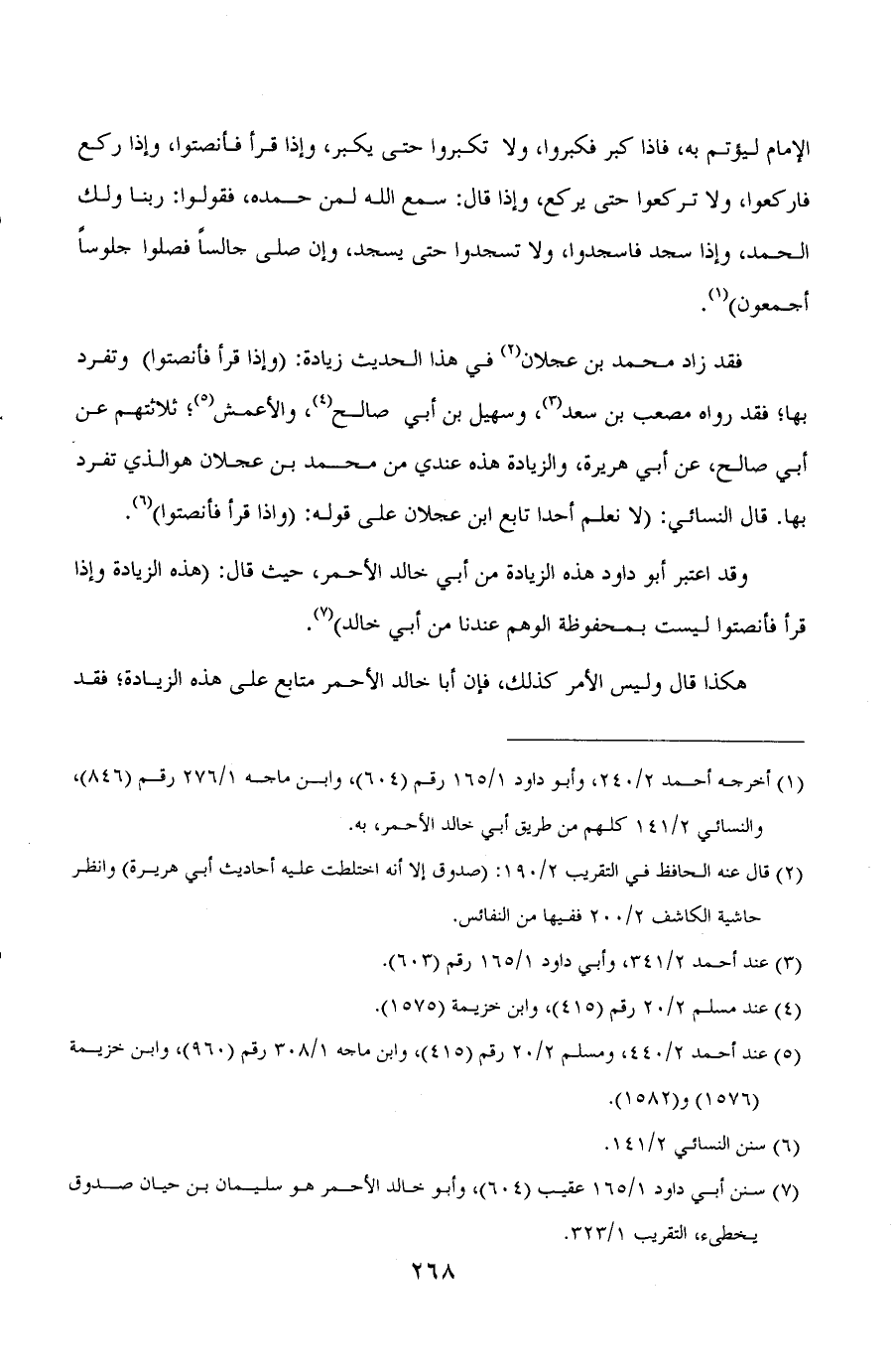 فقد زاد محمد بن عجلان (¬2) في هذا الحديث زيادة: ((واذا قرأ فأنصتوا)) وتفرد بها؛ فقد رواه مصعب بن سعد (¬3) ، وسهيل بن أبي صالح (¬4) ، والأعمش (¬5) ؛ ثلاثتهم عن أبي صالح، عن أبي هريرة، والزيادة هذه عندي من محمد بن عجلان هو الذي تفرد بها. قال النسائي: ((لا نعلم أحدا تابع ابن عجلان على قوله: ((واذا قرأ فأنصتوا)) (¬6) .
