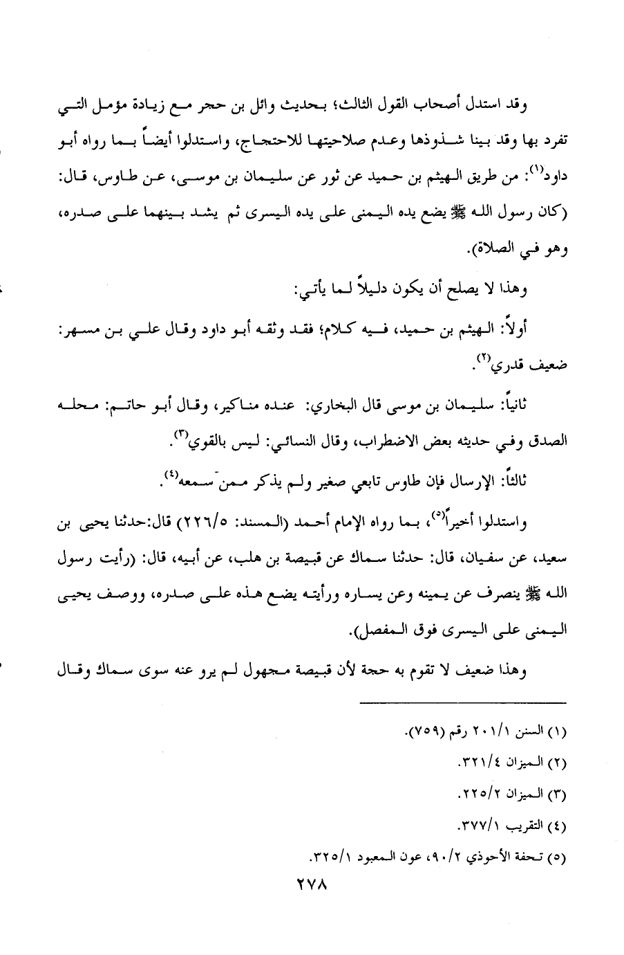 واستدلوا أخيرا (¬5) ، بما رواه الامام أحمد (المسند: 5/226) قال: حدثنا يحيى بن سعيد، عن سفيان، قال: حدثنا سماك عن قبيصة بن هلب، عن أبيه، قال: ((رأيت رسول الله صلى الله عليه وسلم ينصرف عن يمينه وعن يساره ورأيته يضع هذه على صدره، ووصف يحيى اليمنى على اليسرى فوق المفصل)) .