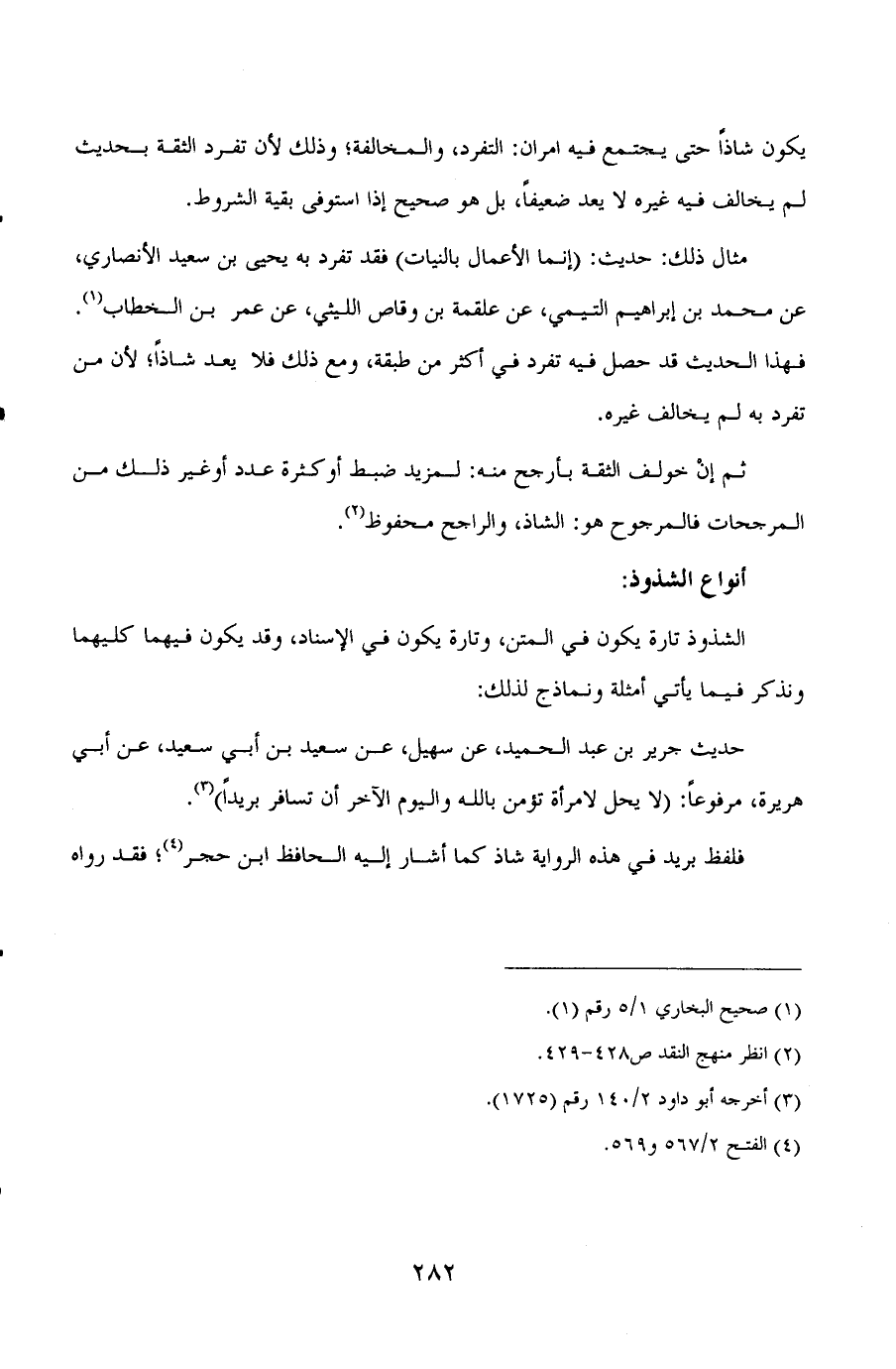 ثم ان خولف الثقة بأرجح منه: لمزيد ضبط او كثرة عدد أو غير ذلك من المرجحات فالمرجوح هو: الشاذ، والراجح محفوظ (¬2)