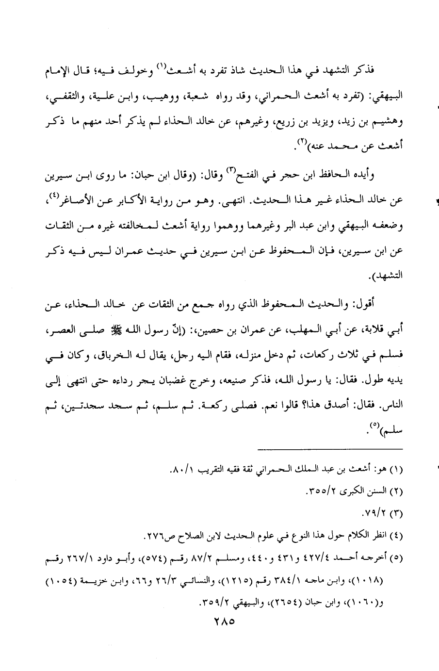 وأيده الحافظ ابن حجر في الفتح (¬3) وقال: ((وقال ابن حبان: ما روى ابن سيرين عن خالد الحذاء غير هذا الحديث. انتهى. وهو من رواية الأكابر عن الأصاغر (¬4) ، وضعفه البيهقي وابن عبد البر وغيرهما ووهموا رواية أشعث لمخالفته غيره من الثقات عن ابن سيرين، فان المحفوظ عن ابن سيرين في حديث عمران ليس فيه ذكر التشهد)) .