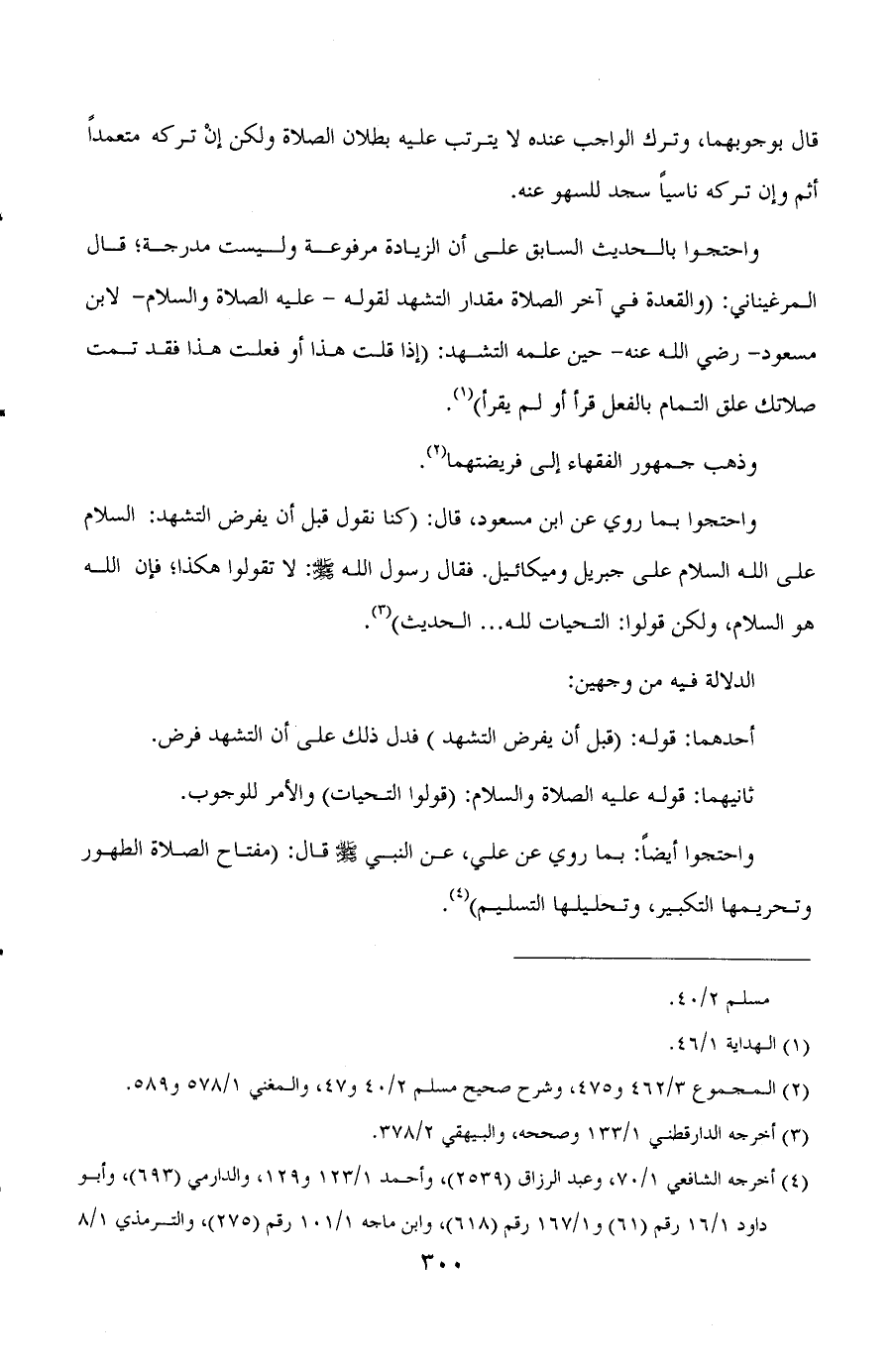 واحتجوا بالحديث السابق على ان الزيادة مرفوعة وليست مدرجة؛ قال المرغيناني: ((والقعدة في آخر الصلاة مقدار التشهد لقوله - عليه الصلاة والسلام- لابن مسعود- رضي الله عنه- حين علمه التشهد: ((اذا قلت هذا أو فعلت هذا فقد تمت صلاتك علق التمام بالفعل قرأ أو لم يقرأ)) (¬1) .