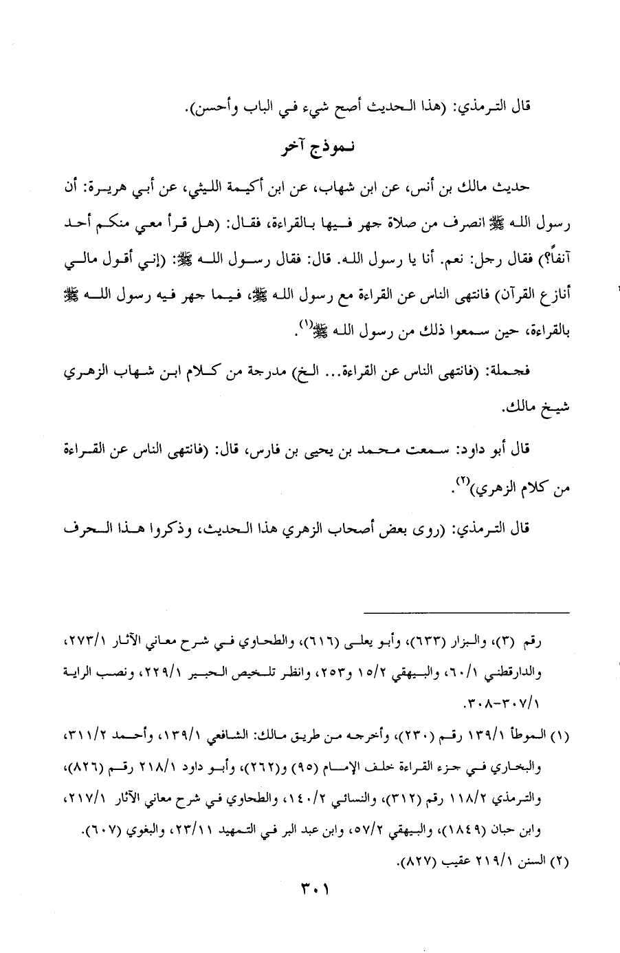 نموذج آخرحديث مالك بن أنس، عن ابن شهاب، عن ابن أكيمة الليثي، عن أبي هريرة: ان رسول الله صلى الله عليه وسلم انصرف من صلاة جهر فيها بالقراءة، فقال: ((هل قرأ معي منكم أحد آنفا؟)) فقال رجل: نعم. أنا يا رسول الله. قال: فقال رسول الله صلى الله عليه وسلم: ((اني أقول مالي أنازع القرآن)) فانتهى الناس عن القراءة مع رسول الله صلى الله عليه وسلم، فيما جهر فيه رسول الله صلى الله عليه وسلم بالقراءة، حين سمعوا ذلك من رسول الله صلى الله عليه وسلم (¬1) .
