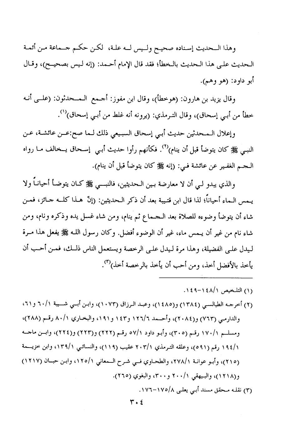 واعلال المحدثين حديث أبي اسحاق السبيعي ذلك لما صح: عن عائشة، عن النبي صلى الله عليه وسلم كان يتوضأ قبل أن ينام)) (¬2) . فكأنهم رأوا حديث أبي اسحاق يخالف ما رواه الجم الغفير عن عائشة في: ((انه صلى الله عليه وسلم كان يتوضأ قبل أن ينام)) .