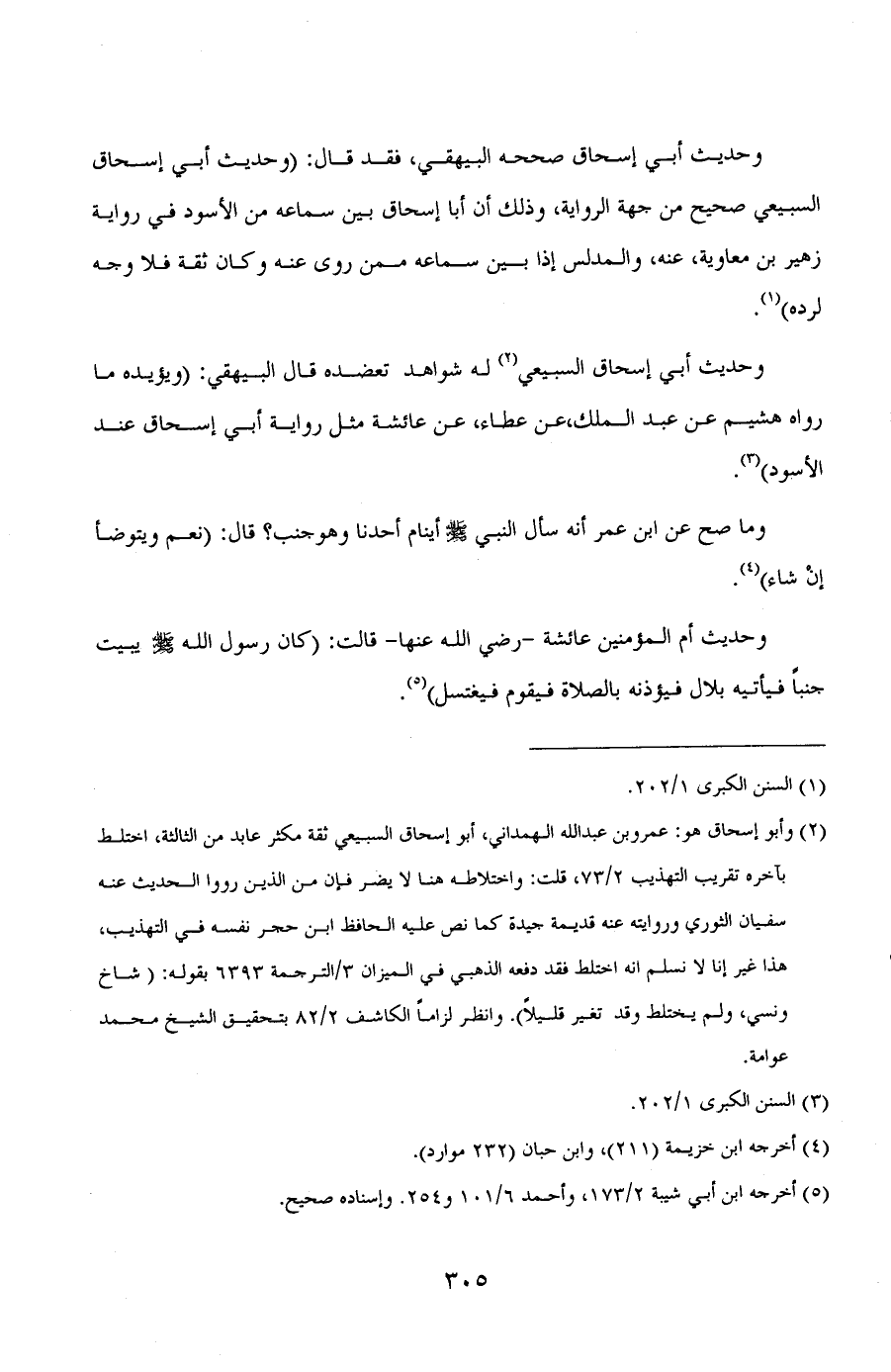 وحديث أبي اسحاق صححه البيهقي، فقد قال: ((وحديث أبي اسحاق السبيعي صحيح من جهة الرواية، وذلك أن أبا اسحاق بين سماعه من الأسود في رواية زهير بن معاوية، عنه، والمدلس اذا بين سماعه ممن روى عنه وكان ثقة فلا وجه لرده)) (¬1) .