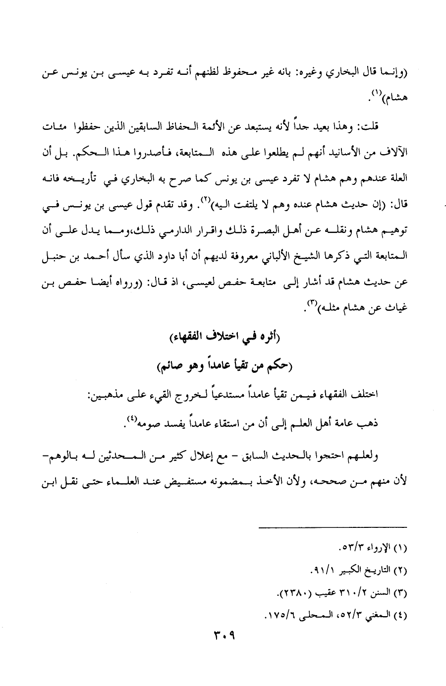 قلت: وهذا بعيد جدا لأنه يستبعد عن الأئمة الحفاظ السابقين الذين حفظوا مئات الآلاف من الأسانيد أنهم لم يطلعوا على هذه المتابعة، فأصدروا هذا الحكم. بل ان العلة عندهم وهم هشام لا تفرد عيسى بن يونس كما صرح به البخاري في تأريخه فانه قال: ((ان حديث هشام عنده وهم لا يلتفت اليه)) (¬2) . وقد تقدم قول عيسى بن يونس في توهيم هشام ونقله عن أهل البصرة ذلك واقرار الدارمي ذلك، ومما يدل على أن المتابعة التي ذكرها الشيخ الألباني معروفة لديهم أن أبا داود الذي سأل أحمد بن حنبل عن حديث هشام قد أشار الى متابعة حفص لعيسى، اذ قال: ((ورواه أيضا حفص بن غياث عن هشام مثله)) (¬3)