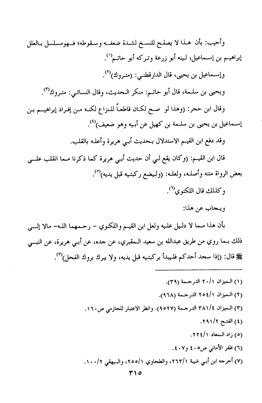 بأن هذا مما لا دليل عليه ولعل ابن القيم واللكنوي - رحمهما الله- ما لا الى ذلك بما روي من طريق عبد الله بن سعيد المقبري، عن جده، عن أبي هريرة، عن النبي صلى الله عليه وسلم قال: ((اذا سجد أحدكم فليبدأ بركبتيه قبل يديه، ولا يبرك بروك الفحل)) (¬7) .
