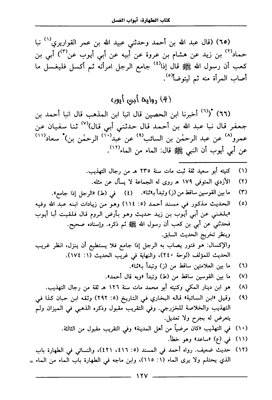 65 - قَالَ عَبْدُ اللَّهِ بْنُ أَحْمَدَ، وَحَدَّثَنِي عُبَيْدُ اللَّهِ بْنُ عُمَرَ الْقَوَارِيرِيُّ، نَبَا حَمَّادُ بْنُ زَيْدٍ، عَنْ هِشَامِ بْنِ عُرْوَةَ، عَنْ أَبِيهِ، عَنْ أَبِي أَيُّوبَ، عَنْ أُبَيِّ بْنِ كَعْبٍ، أَنّ رَسُولَ اللَّهِ صَلَّى اللَّهُ عَلَيْهِ وَسَلَّمَ، قَالَ: «إِذَا جَامَعَ الرَّجُلُ امْرَأَتَهُ، ثُمَّ أَكْسَلَ، فَلْيَغْسِلْ مَا أَصَابَ الْمَرْأَةَ مِنْهُ، ثُمَّ لِيَتَوَضَّأْ»