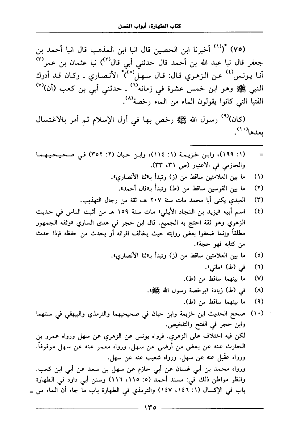 75 - أَخْبَرَنَا ابْنُ الْحُصَيْنِ، قَالَ: أَنْبَأَ ابْنُ الْمُذْهِبِ، قَالَ: أَنْبَأَ أَحْمَدُ بْنُ جَعْفَرٍ، قَالَ: نَبَا عَبْدُ اللَّهِ بْنُ أَحْمَدَ، قَالَ: حَدَّثَنِي أَبِي، قَالَ: نَبَا عُثْمَانُ بْنُ عُمَرَ، أَنَا يُونُسَ، عَنِ الزُّهْرِيِّ، قَالَ: قَالَ سَهْلٌ الْأَنْصَارِيُّ، وَكَانَ قَدْ أَدْرَكَ النَّبِيَّ صَلَّى اللَّهُ عَلَيْهِ وَسَلَّمَ وَهُوَ ابْنُ خَمْسَ عَشْرَةَ فِي زَمَانِهِ، حَدَّثَنِي أُبَيُّ بْنُ كَعْبٍ أَنَّ الْفِتْيَا الَّتِي كَانُوا يَقُولُونَ: الْمَاءُ مِنَ الْمَاءِ رُخْصَةٌ.