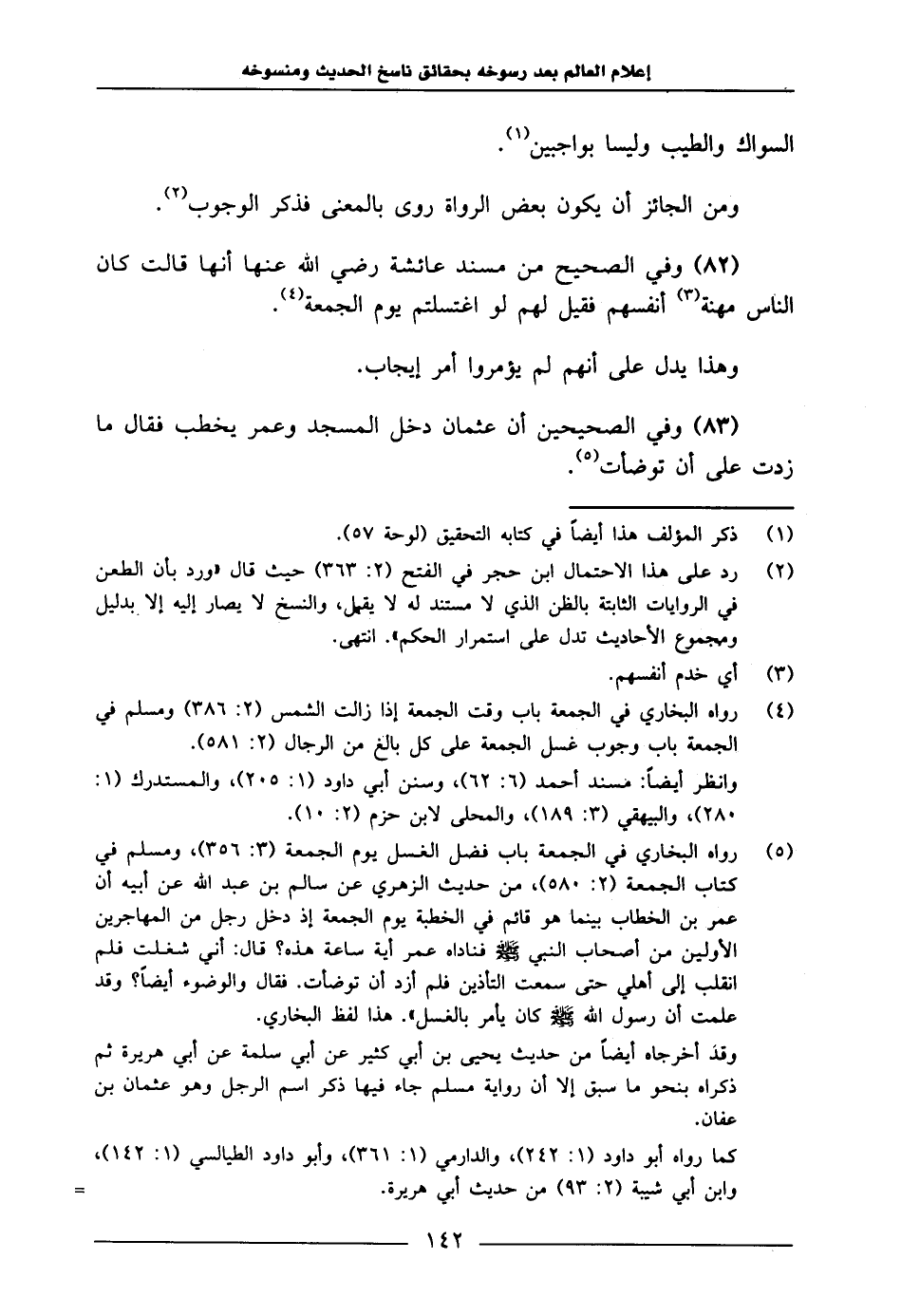 وَمِنَ الْجَائِزِ أَنْ يَكُونَ بَعْضُ الرُّوَاةِ رَوَى بِالْمَعْنَى، فَذَكَرَ الْوُجُوبَ 81 82 - وَفِي الصَّحِيحِ مِنْ مُسْنَدِ عَائِشَةَ رَضِيَ اللَّهُ عَنْهَا، أَنَّهَا قَالَتْ: «كَانَ النَّاسُ مِهْنَةَ أَنْفُسُهُمْ، فَقِيلَ لَهُمْ لَوِ اغْتَسَلْتُمْ يَوْمَ الْجُمُعَةِ» .