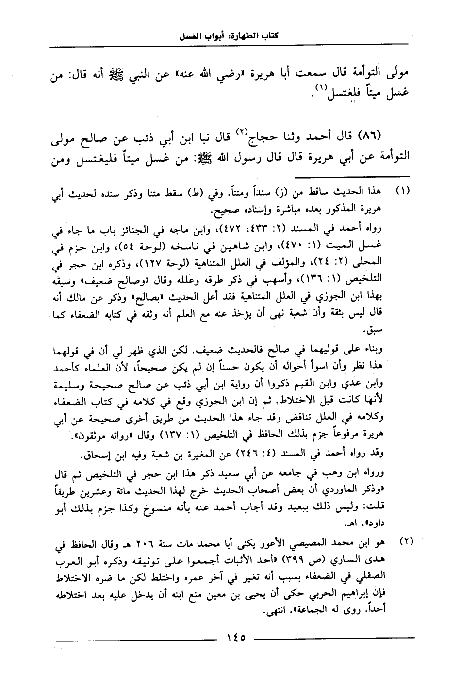 86 - قَالَ أَحْمَدُ: وَثنَا حجاج قال: نبا ابْنِ أَبِي ذِئْبٍ، عن صَالِحٌ مَوْلَى التَّوْأَمَةِ، عن أَبَا هُرَيْرَةَ رَضِيَ اللَّهُ عَنْهُ قَالَ: قَالَ رَسُولُ اللَّهِ صَلَّى اللَّهُ عَلَيْهِ وَسَلَّمَ: «مَنْ غَسَّلَ مَيِّتًا فَلْيَغْتَسِلْ، وَمَنْ